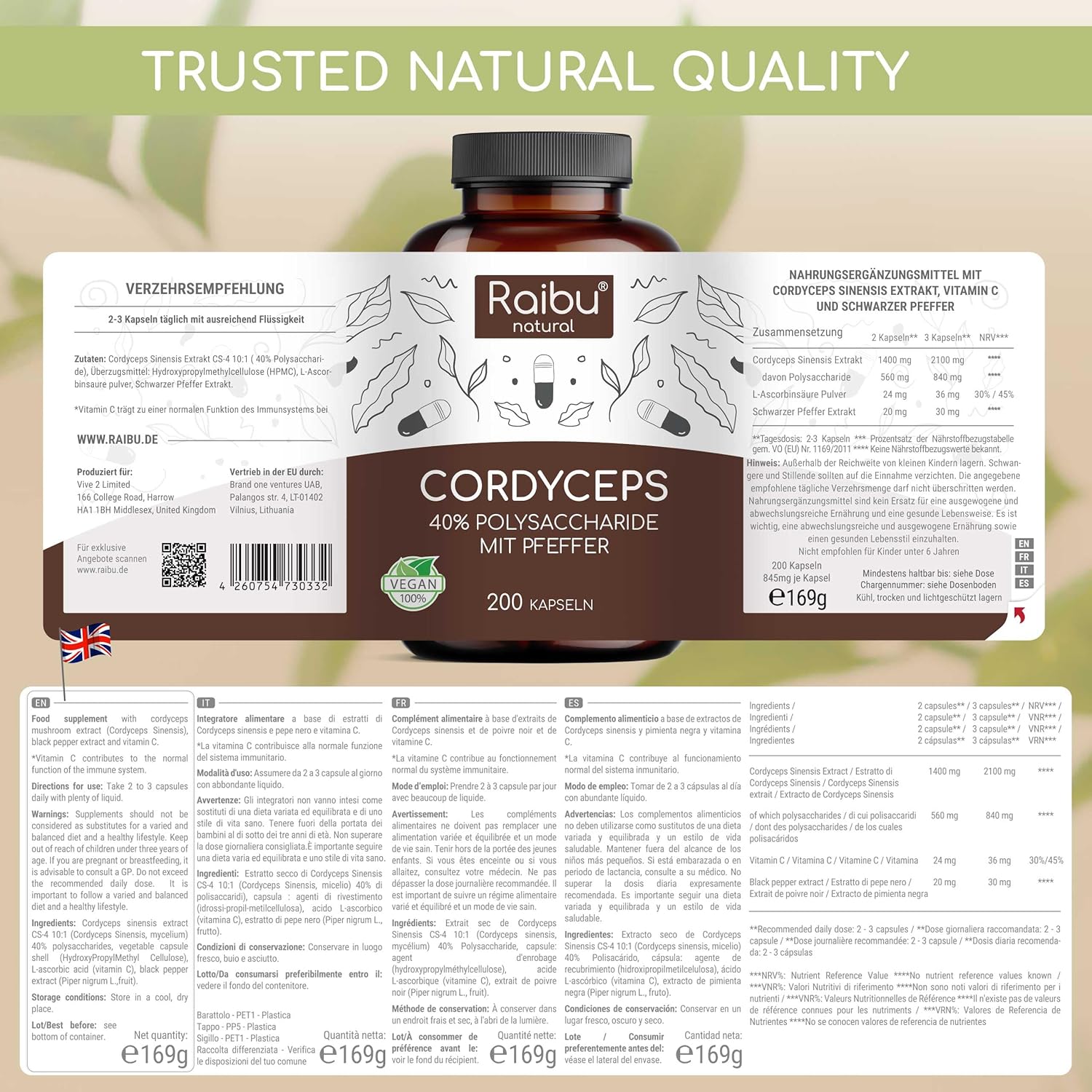 Raibu Cordyceps Capsules - 21000Mg Mushroom Content Per Daily Dose (10:1 Extract) - 200 Vegan Capsules - Cordyceps Supplement With Black Pepper & Vitamin C For Well-Being - No Additives & Lab Tested