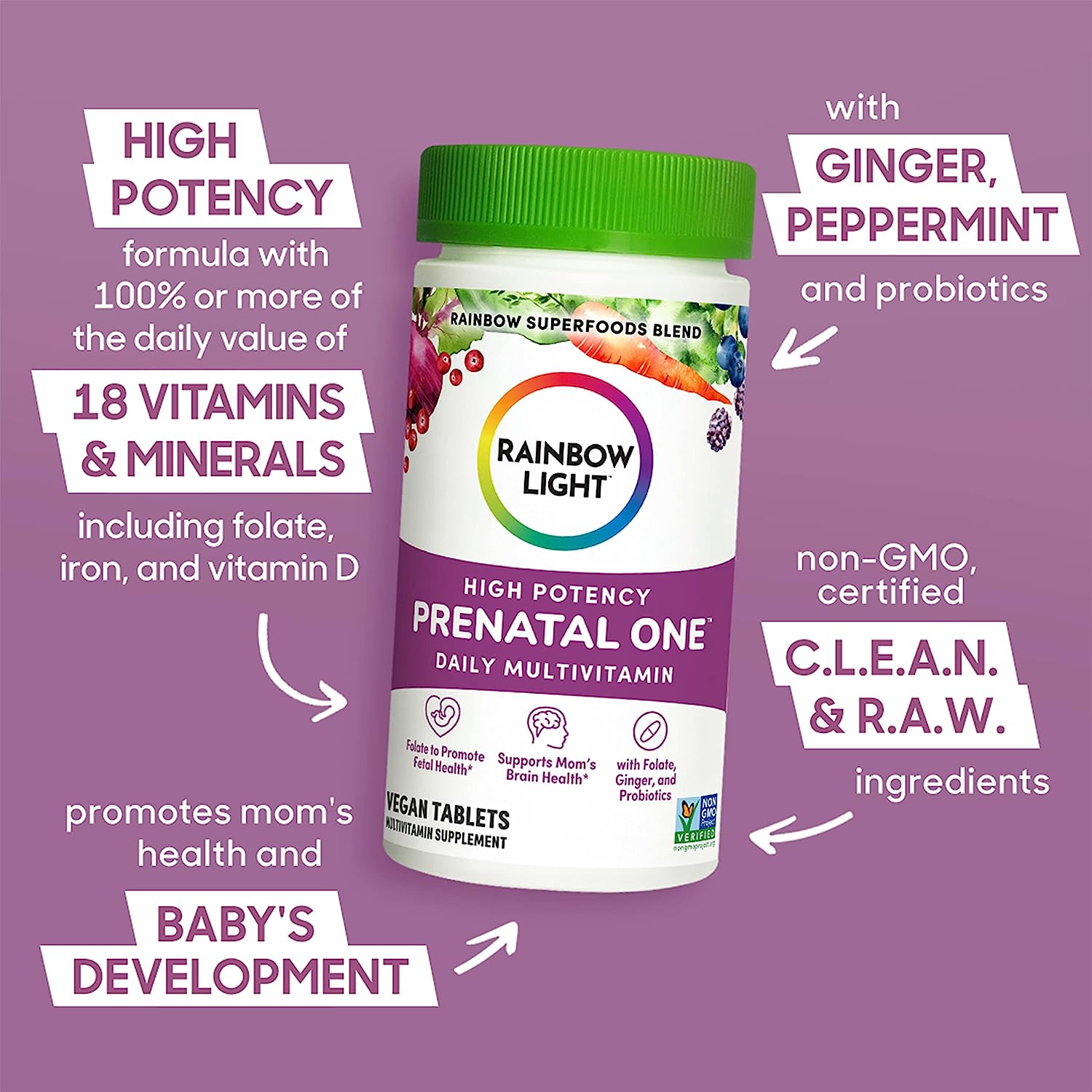 Rainbow Light Prenatal One High-Potency Daily Multivitamin is a high-potency multivitamin for women that supports optimal nutrition and replenishment to give you a solid foundation today and every day (1). Made specifically for mothers, this multivitamin supports moms and babies from conception to nursing (1). Formulated with 100% or more of the daily value of 18 vitamins and ready-to-absorb minerals, this womens multivitamin includes more vitamin C than the previous Rainbow One Prenatal Vitamin to nourish mothers health and babies development. The folate in this women's multivitamin works alongside iron, ginger and womens probiotics to promote fetal health and moms brain health. Thiamin is also included to support normal heart function in women (1). These prenatal vitamins also promote a babys healthy brain and neural tube development in the early stages of pregnancy (1). Everyone-friendly, this multivitamin is vegan, Non-GMO Project Verified, Certified C.L.E.A.N., Certified R.A.W. and gluten free. (1) These statements have not been evaluated by the Food and Drug Administration. This product is not intended to diagnose, treat, cure, or prevent any disease