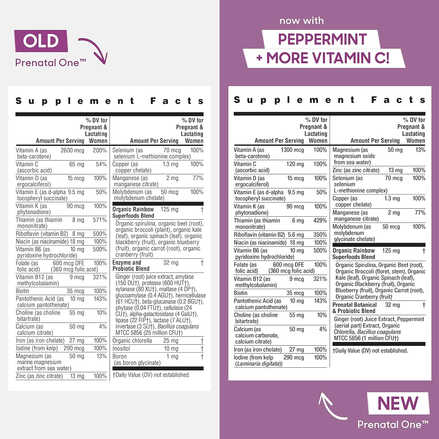 VITAMINS: Prenatal One High-Potency Multivitamin has 100% daily recommended value of folate, iron and vitamin D; includes ginger, probiotics, peppermint and more vitamin C than our previous formula