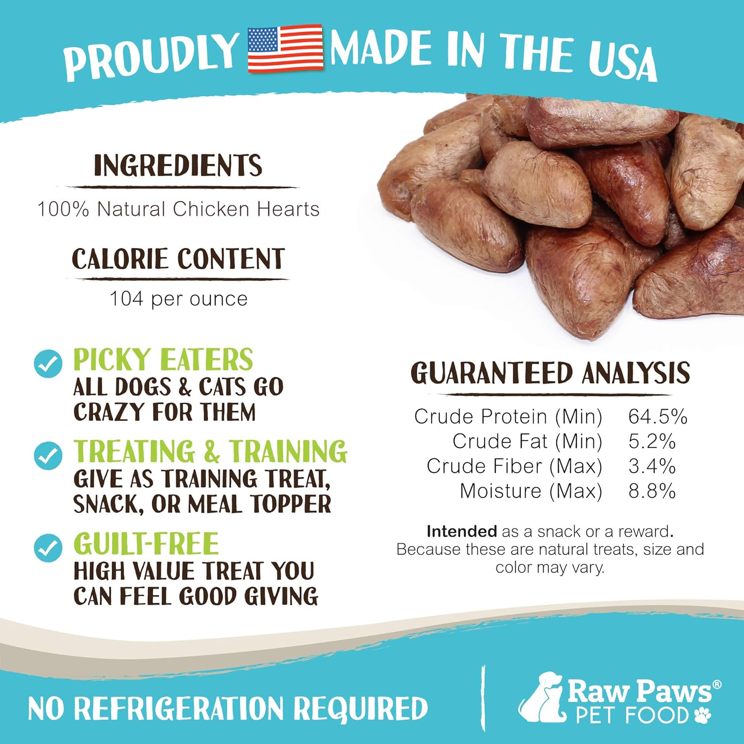 Raw Paws Chicken Hearts Dog Treats Are 100% All-Natural, Nutrient-Dense Single Ingredient Dog Treats Made Without Any Preservatives, Fillers, By-Products Or Artificial Flavors! Our Freeze Dried Chicken Hearts For Cats And Dogs Are Sourced From Free-Range Chickens Raised On American Family Farms. These Human-Grade Tasty Treats Provide Essential Nutrition And Taste Of Real Meat That Dogs And Cats Instinctively Crave! Even The Pickiest Of Eaters Go Crazy For Our Preservative Free Dog Treats. As One Of The Best Natural Sources Of Taurine, Our Raw Treats For Dogs And Cats Provide Protein For Pets, Promote Healthy Growth And Development, Enhance The Immune System And Support Cats And Dogs Heart Health. Chicken Heart Treats Are Loaded With Essential Vitamins And Nutrients Our Pets Need To Thrive. Don'T Compromise Nutrition For Convenience! Our Delicate Freeze Drying Process, Unlike The Process For Dehydrated Hearts, Locks In The Nutrients, Enzymes, Flavor And Freshness Of Raw Chicken Hearts. This Allows These Healthy Treats To Be Safely And Conveniently Stored Without Refrigeration. Ideal For Dogs And Cats Of All Breeds And Ages. Serve As A Daily Treat, Special Reward, Or Add Water To Rehydrate And Use As A Pet Food Topper. Raw Paws Pet Food Is A Family Owned Business That Believes The Best Chance Of Having A Happy Pet Is Through The Highest Quality Nutrition. That'S Why We Use Only The Freshest, All-Natural Ingredients To Make Our Mouthwatering Raw Freeze Dried Dog Treats And Cat Treats! When You Shop With Raw Paws Pet Food You Can Have Peace Of Mind Knowing That You'Re Giving Your Pets Only Healthy Freeze Dried Cat Treats And Dog Treats! Raw Paws Chicken Heart Dog Treats From Our Family To Yours: We Only Use Responsible And Ethical Sources, So You Get The Highest-Quality Products Made With The Freshest Ingredients! Our Freeze Dried Chicken Hearts For Dogs And Cats Are Sourced And Made In The Usa. We Pack And Hand-Inspect These Hearts For Dogs In Our Indianapolis Facility! Rich In Natural Taurine: These Raw Treats For Cats And Dogs Are Packed With Taurine, Which Is An Amino Acid That Supports Heart, Brain And Eye Health. Use These Freeze Dried Chicken Hearts Dog Treats As Nutrient-Dense Snacks, Training Treats Or As A Special Reward! Only One Ingredient: Chicken Heart Bites Are Single Ingredient Cat Treats And Dog Treats, Perfect For Pets With Allergies, Skin Issues Or Sensitivities. Freeze Dried Raw Dog Treats Make Great Pet Food Toppers! Serve As Is Or Rehydrate With Water. 100% All-Natural Rich In Taurine Iron + Zinc Lean Protein Heart Health Support Essential Fatty Acids Made In Usa