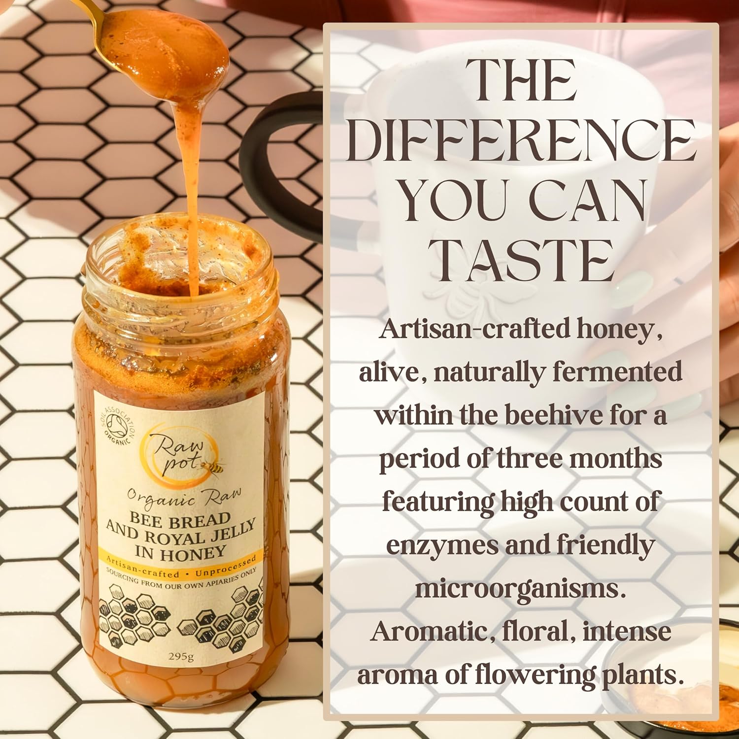 Raw Pot - Organic Raw Bee Bread And Royal Jelly In Honey - Natural Pure Unpasteurised Honey With Antioxidants & Phytonutrients For Immunity, Detox, Digestion, Energy Support | For Kids & Adults (295G)