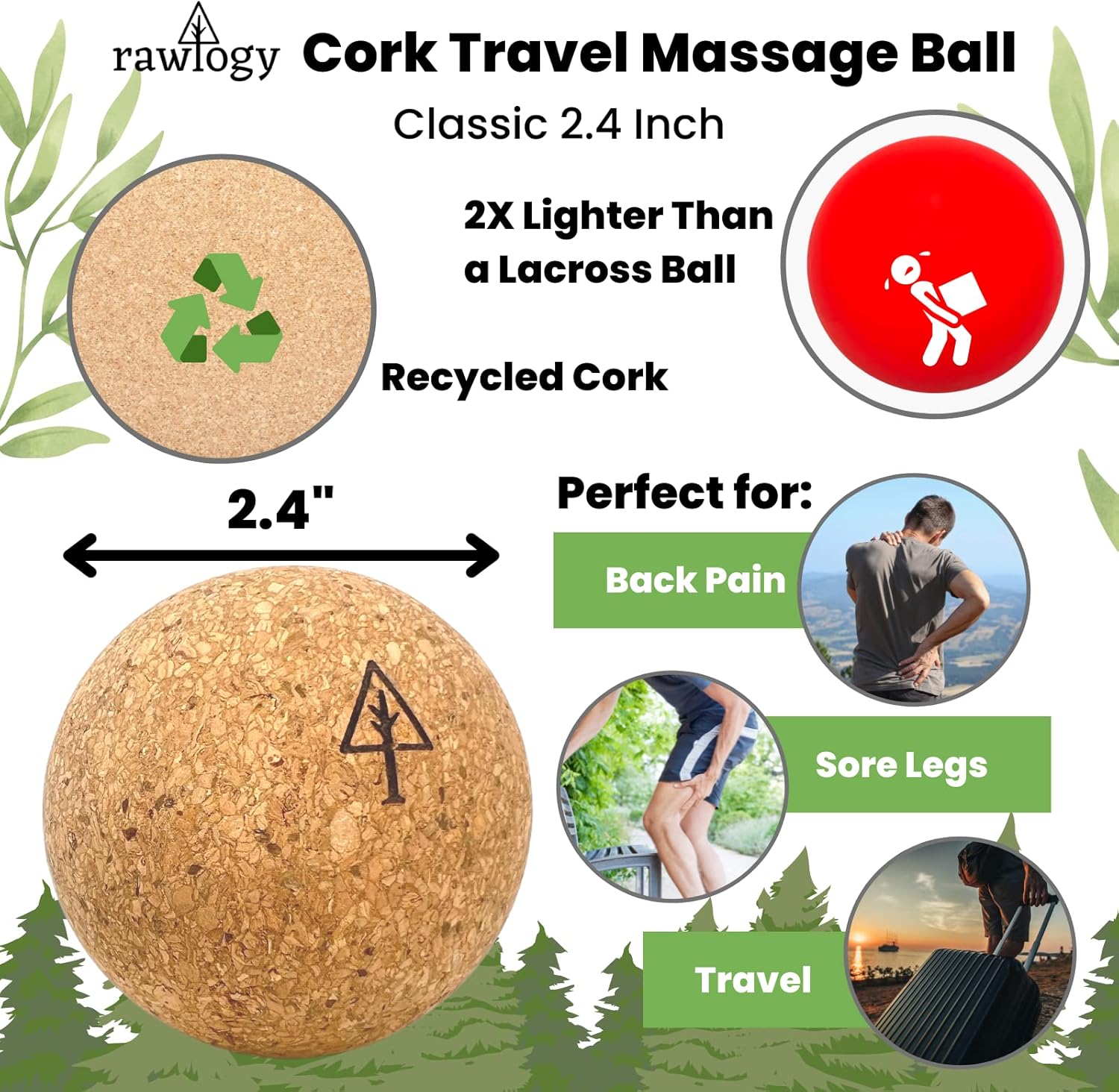 About The Product : THE ECO-FRIENDLY WAY TO RELIEVE MUSCLE TENSION, KNOTS & TIGHT FASCIA: Meet the original eco-friendly massage ball--made from 100% recycled cork. Rawlogy's ultra-firm cork 2.5" massage ball is conscientiously made from recycled wine corks, and completely free of chemicals likes BPA, plastics, PVC and petroleum