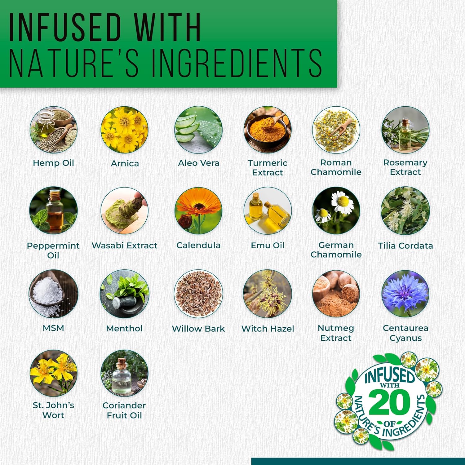 %  +      : Real Time Pain Relief Hemp Oil Plus features a high 5% concentration of Arnica Montana and a blend of 20 carefully selected natural ingredients like Hemp Oil, Rosemary, Turmeric, Wasabi, Menthol, Nutmeg, and Aloe Vera. Ideal for those seeking a nature-inspired solution for everyday wellness