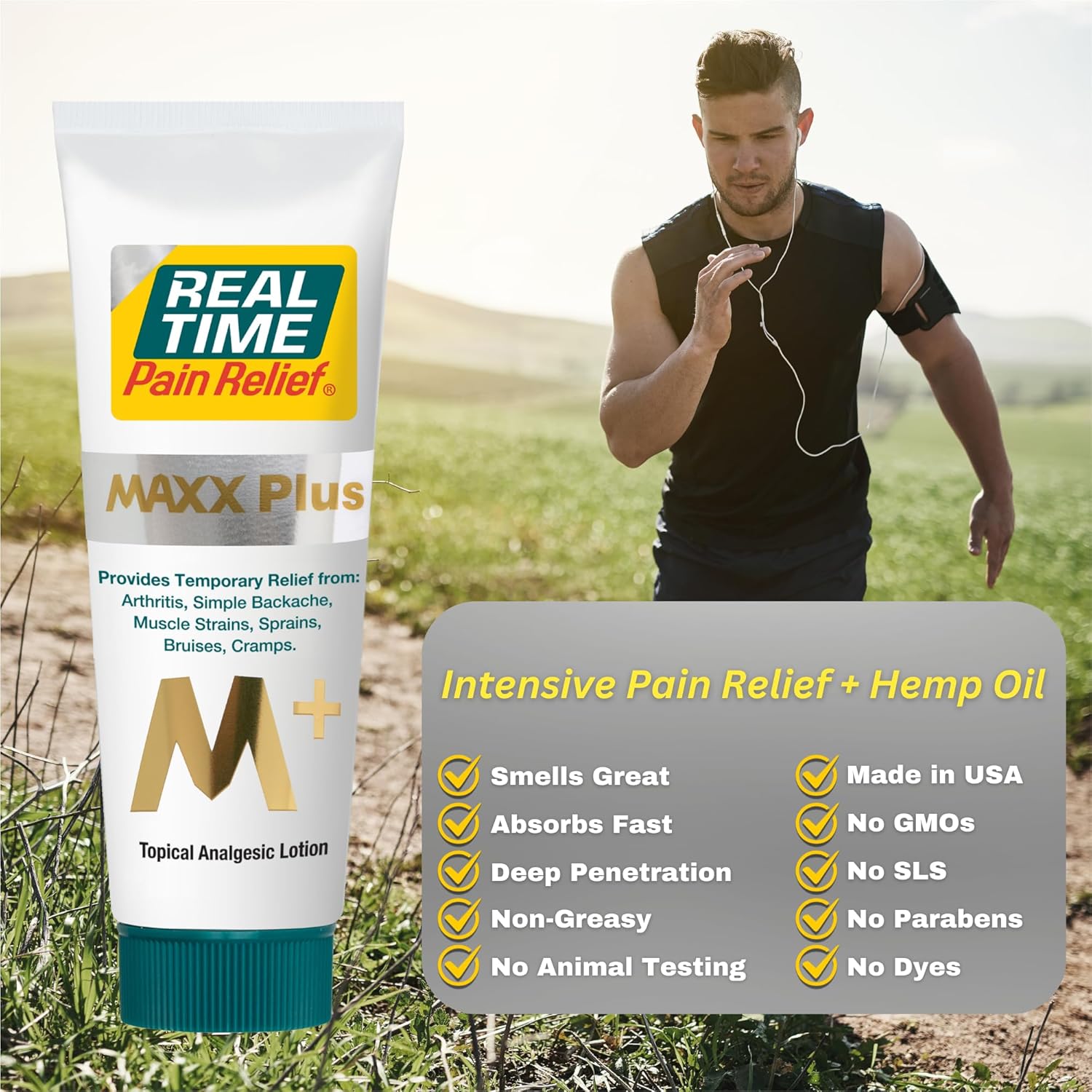 About this item INTENSIVE PAIN RELIEF WHERE NEEDED - Real Time Pain Relief MAXX Plus is our most popular formula, now enhanced with Hemp Oil for even greater relief. It effectively targets Arthritis Pain, Muscle Strains, Cramps, Sprains, Bruises, and more. Apply generously to shoulder pain, back pain, joint pain, neck pain, sciatica pain, knee pain, elbow pain, hand pain, or foot pain for fast-acting and long-lasting relief. RICH BLEND OF 19 NATURAL INGREDIENTS - Real Time Pain Relief MAXX Plus is crafted with 19 natural ingredients, meticulously selected for their known properties to provide deep-penetrating relief whenever and wherever you need it. With ingredients like Menthol, Arnica, Capsicum, Peppermint Oil, Aloe Vera, Emu Oil, and now Hemp Seed Oil, MAXX Plus offers powerful relief without compromise. EASY TO USE & REFRESHING SCENT - MAXX Plus is formulated for quick absorption, ensuring soothing relief without any greasy residue. Experience the comforting warmth and pleasant, minty aroma of MAXX Plus, enhanced by the cooling sensation of Peppermint Oil. It's a refreshing solution for intense pain relief. PROUDLY FORMULATED & PACKAGED IN THE USA - Real Time Pain Relief MAXX Plus is proudly formulated and packaged in the USA, adhering to stringent quality standards and supporting local production. Trust in the quality and reliability of a product made with care and expertise. INTENSIVE RELIEF FOR EVERYDAY ACHES: - Whether you're facing everyday discomfort or recovering from an injury, Real Time Pain Relief MAXX Plus offers intensive relief to help you reclaim your active lifestyle. Don't let pain hold you back; choose MAXX Plus for powerful relief that lasts. SAFE FOR THE WHOLE FAMILY SINCE 1998 - With a commitment to natural healing, Real Time Pain Relief MAXX is formulated without GMOs, parabens, SLS, or artificial dyes. MAXX harnesses the power of nature's ingredients to provide safe and effective relief for pain, whenever and wherever you need it.  See more product details,INTENSIVE PAIN RELIEF WHERE NEEDED - Real Time Pain Relief MAXX Plus is our most popular formula, now enhanced with Hemp Oil for even greater relief. It effectively targets Arthritis Pain, Muscle Strains, Cramps, Sprains, Bruises, and more. Apply generously to shoulder pain, back pain, joint pain, neck pain, sciatica pain, knee pain, elbow pain, hand pain, or foot pain for fast-acting and long-lasting relief,RICH BLEND OF 19 NATURAL INGREDIENTS - Real Time Pain Relief MAXX Plus is crafted with 19 natural ingredients, meticulously selected for their known properties to provide deep-penetrating relief whenever and wherever you need it. With ingredients like Menthol, Arnica, Capsicum, Peppermint Oil, Aloe Vera, Emu Oil, and now Hemp Seed Oil, MAXX Plus offers powerful relief without compromise,EASY TO USE & REFRESHING SCENT - MAXX Plus is formulated for quick absorption, ensuring soothing relief without any greasy residue. Experience the comforting warmth and pleasant, minty aroma of MAXX Plus, enhanced by the cooling sensation of Peppermint Oil. It's a refreshing solution for intense pain relief,PROUDLY FORMULATED & PACKAGED IN THE USA - Real Time Pain Relief MAXX Plus is proudly formulated and packaged in the USA, adhering to stringent quality standards and supporting local production. Trust in the quality and reliability of a product made with care and expertise,INTENSIVE RELIEF FOR EVERYDAY ACHES: - Whether you're facing everyday discomfort or recovering from an injury, Real Time Pain Relief MAXX Plus offers intensive relief to help you reclaim your active lifestyle. Don't let pain hold you back; choose MAXX Plus for powerful relief that lasts,SAFE FOR THE WHOLE FAMILY SINCE 1998 - With a commitment to natural healing, Real Time Pain Relief MAXX is formulated without GMOs, parabens, SLS, or artificial dyes. MAXX harnesses the power of nature's ingredients to provide safe and effective relief for pain, whenever and wherever you need it