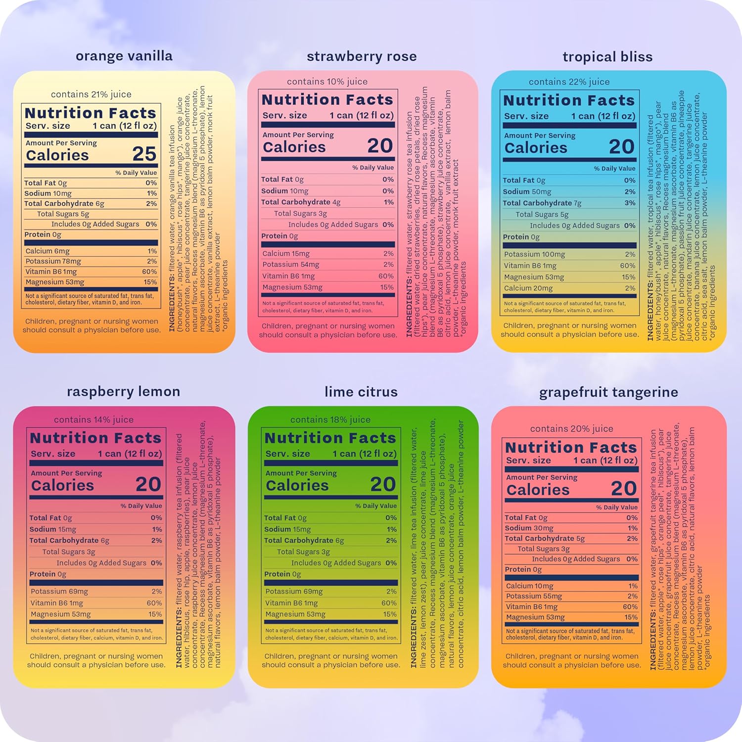 TRY EVERY FLAVOR: The 12-pack sampler features 2 cans of all of our fan favorites: Strawberry Rose, Orange Vanilla, Raspberry Lemon, Lime Citrus, Tropical Bliss, and Grapefruit Tangerine. Each flavor is brewed with real ingredients like dried strawberries and raspberries