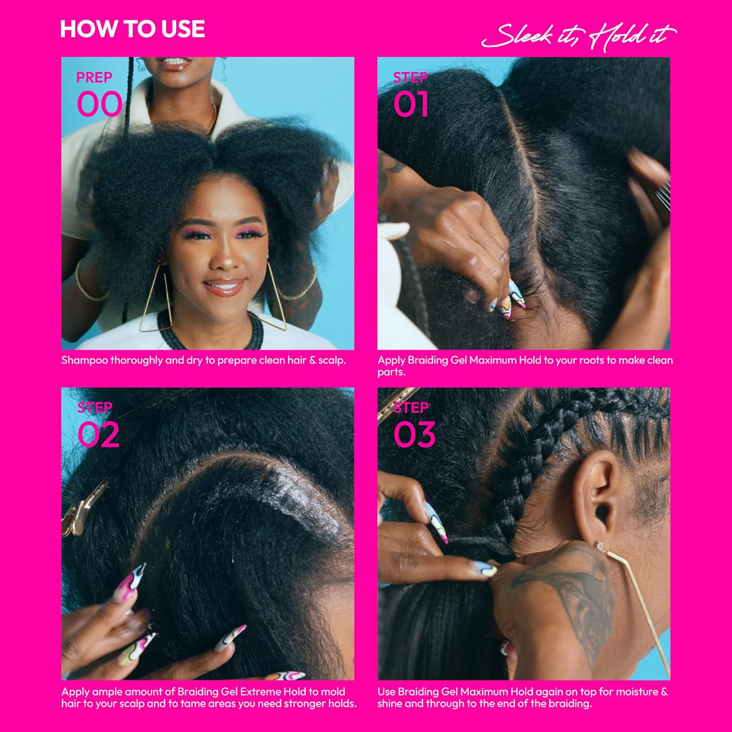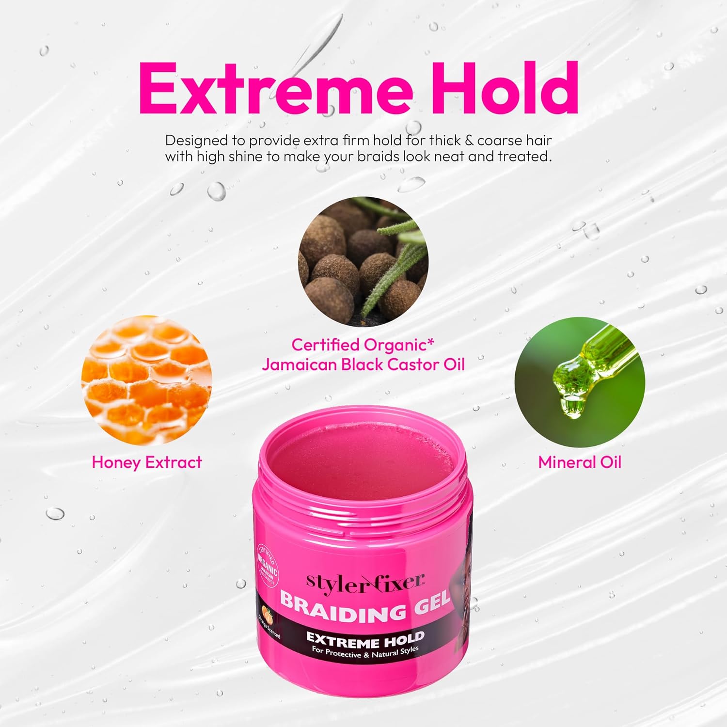 About this item Maximum Hold & High Shine: The Styler Fixer Braiding Gel offers an unmatched combination of maximum hold and high shine, ideal for all hair types and styles. It ensures long-lasting hold without sticky or flaky residue, meeting the needs of reviewers who seek reliable performance Organic Nourishment for Braids: Enriched with Certified Organic Jamaican Black Castor Oil and Honey Extract, this gel keeps braids hydrated and nourished. Users appreciate the natural ingredients that ensure hair looks soft, healthy, and sleek without any residue Versatile Styling for All Occasions: Whether it's a special event or everyday neatness, the Styler Fixer Braiding Gel is a top choice. It's praised for providing a polished look that keeps braids fresh and neat, becoming a staple in users' hair care routines Optimal Application for Sleek Results: For the best outcome, applying a generous amount to the roots and along the braids is recommended. Following up with Styler Fixer Foam Mousse adds moisture, ensuring braids stay sleek and polished, as testified by satisfied users Complete Braiding System for Maximum Benefits: Our Styler Fixer braiding system is specially designed to provide the best results when used together as a complete set. The FOAM MOUSSE & BRAID SHEEN REFRESHER is formulated to hydrate and soothe the hair and scalp. Using these products before and after braiding your hair with the Braiding Gel will prevent any flaky residue See more product details,Maximum Hold & High Shine: The Styler Fixer Braiding Gel offers an unmatched combination of maximum hold and high shine, ideal for all hair types and styles. It ensures long-lasting hold without sticky or flaky residue, meeting the needs of reviewers who seek reliable performance,Organic Nourishment for Braids: Enriched with Certified Organic Jamaican Black Castor Oil and Honey Extract, this gel keeps braids hydrated and nourished. Users appreciate the natural ingredients that ensure hair looks soft, healthy, and sleek without any residue,Versatile Styling for All Occasions: Whether it's a special event or everyday neatness, the Styler Fixer Braiding Gel is a top choice. It's praised for providing a polished look that keeps braids fresh and neat, becoming a staple in users' hair care routines,Optimal Application for Sleek Results: For the best outcome, applying a generous amount to the roots and along the braids is recommended. Following up with Styler Fixer Foam Mousse adds moisture, ensuring braids stay sleek and polished, as testified by satisfied users,Complete Braiding System for Maximum Benefits: Our Styler Fixer braiding system is specially designed to provide the best results when used together as a complete set. The FOAM MOUSSE & BRAID SHEEN REFRESHER is formulated to hydrate and soothe the hair and scalp. Using these products before and after braiding your hair with the Braiding Gel will prevent any flaky residue