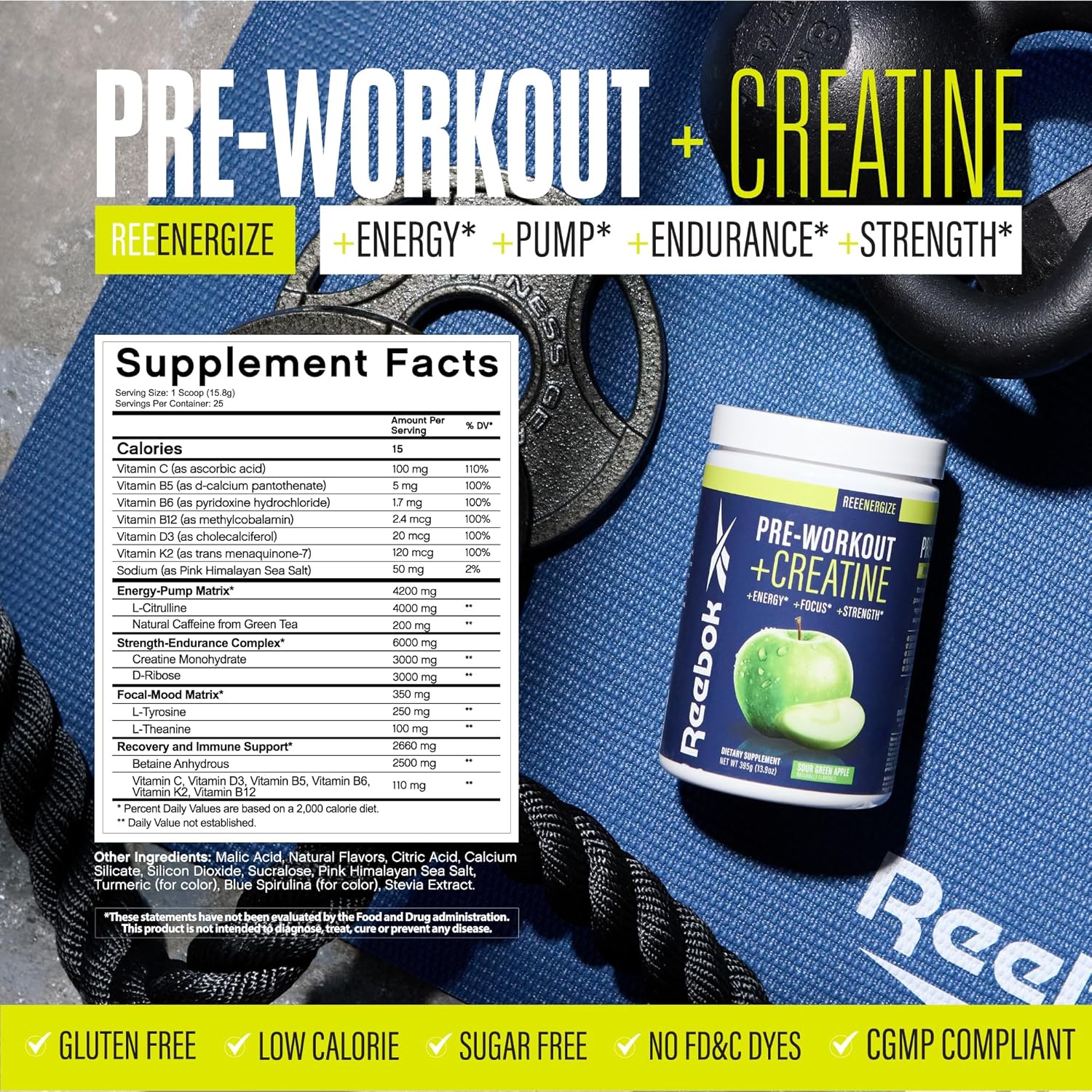 Reebok Pre-Workout Powder | 200Mg Natural Caffeine, 3G Creatine Monohydrate, 4G Citrulline | Strength, Focus & Pump | Informed-Sport Certified | Reeenergize | Sour Green Apple