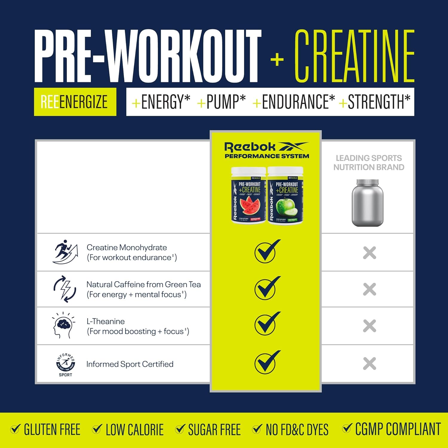 Reebok Pre-Workout Powder | 200Mg Natural Caffeine, 3G Creatine Monohydrate, 4G Citrulline | Strength, Focus & Pump | Informed-Sport Certified | Reeenergize | Watermelon Crush