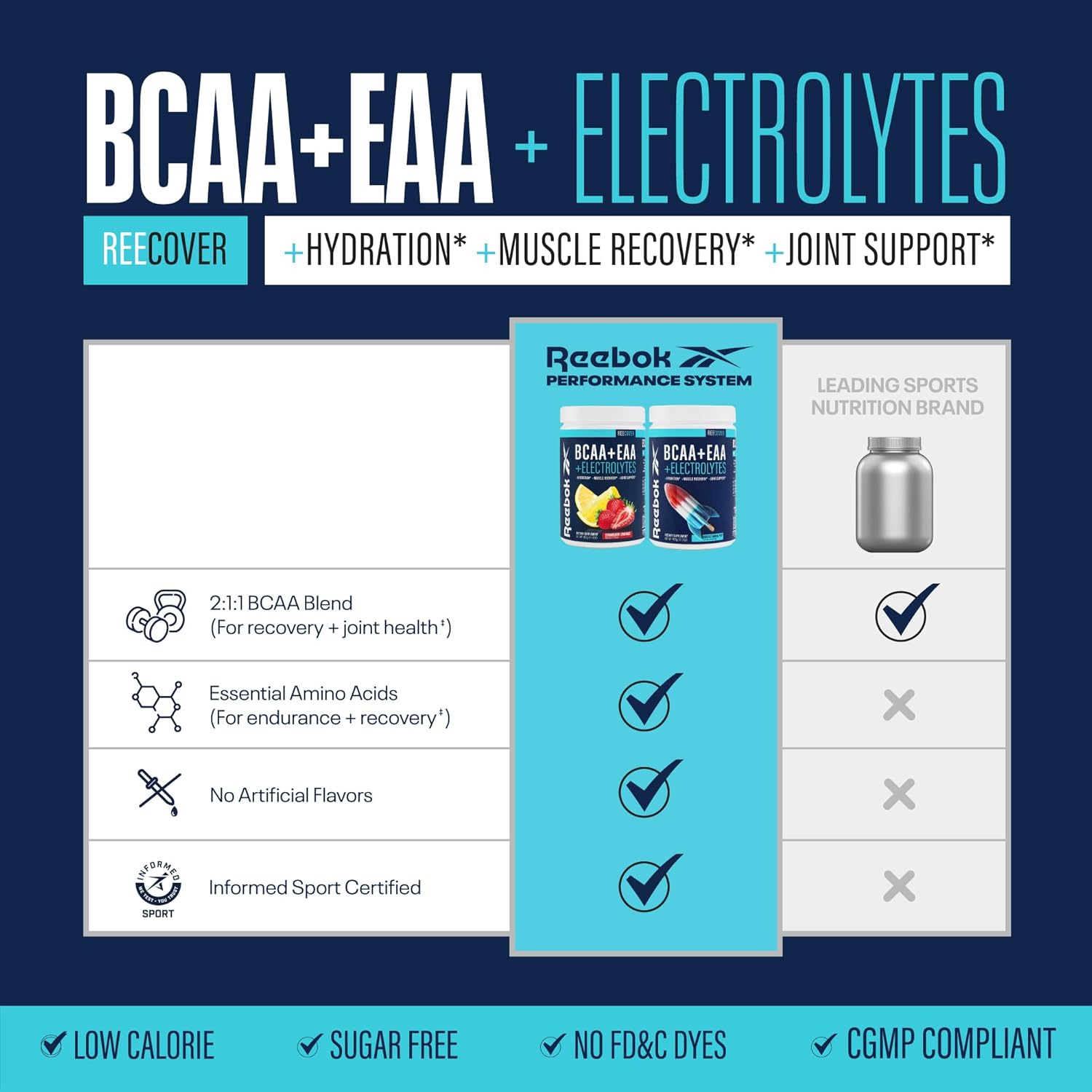 About this item Recover Like a Champion: You’ve put in the work—now it’s time to recover like a pro. Built on Reebok’s heritage of supporting athletes through every step of their journey, [REE]COVER delivers the essential recovery nutrients you need, powered by 8g of Essential Amino Acids (EAAs) and 5g of Branched-Chain Amino Acids (BCAAs). Trust the brand that’s fueled champions for decades to help you bounce back stronger and faster. [REE]COVER is designed to give your muscles the essential nutrients they crave. Irreverent. Inspired. In Control: Reebok’s commitment to helping you recover, rebuild, and return stronger is in every scoop of [REE]COVER. Designed for athletes who demand the best, we’ve stacked our formula with Reebok’s Hydration Matrix, delivering 930mg of electrolytes like sodium, potassium, magnesium, calcium, and the added benefit of pink Himalayan sea salt to restore hydration and rebalance your body after sweat-heavy sessions. Scientifically Formulated for Faster Recovery: With Reebok’s performance-driven legacy, we’ve spent decades understanding what athletes need. Enter [REE]COVER. Speed up muscle recovery and support your joints with a powerhouse blend of amino acids that helps reduce soreness and fatigue. With [REE]COVER, you’ll be ready to attack your next workout harder and faster. Plus, our formula is clean and made to the highest standards, Informed Sport Certified, with zero sugar, and no artificial dyes. Tastes Amazing, Mixes Effortlessly: Recovery has never been this easy—or delicious. Not only does [REE]COVER give your muscles the nutrients they need, it also delivers a refreshing flavor that’s easy to mix, making it the perfect post-workout reward. Delicious Hydration: Indulge in the refreshing flavors of Strawberry Lemonade and Rocket Moon Pop while supporting your fitness goals. Each flavor is carefully crafted to make hydration and recovery both enjoyable and effective › See more product details,Recover Like a Champion: You’ve put in the work—now it’s time to recover like a pro. Built on Reebok’s heritage of supporting athletes through every step of their journey, [REE]COVER delivers the essential recovery nutrients you need, powered by 8g of Essential Amino Acids (EAAs) and 5g of Branched-Chain Amino Acids (BCAAs). Trust the brand that’s fueled champions for decades to help you bounce back stronger and faster. [REE]COVER is designed to give your muscles the essential nutrients they crave,Irreverent. Inspired. In Control: Reebok’s commitment to helping you recover, rebuild, and return stronger is in every scoop of [REE]COVER. Designed for athletes who demand the best, we’ve stacked our formula with Reebok’s Hydration Matrix, delivering 930mg of electrolytes like sodium, potassium, magnesium, calcium, and the added benefit of pink Himalayan sea salt to restore hydration and rebalance your body after sweat-heavy sessions,Scientifically Formulated for Faster Recovery: With Reebok’s performance-driven legacy, we’ve spent decades understanding what athletes need. Enter [REE]COVER. Speed up muscle recovery and support your joints with a powerhouse blend of amino acids that helps reduce soreness and fatigue. With [REE]COVER, you’ll be ready to attack your next workout harder and faster. Plus, our formula is clean and made to the highest standards, Informed Sport Certified, with zero sugar, and no artificial dyes,Tastes Amazing, Mixes Effortlessly: Recovery has never been this easy—or delicious. Not only does [REE]COVER give your muscles the nutrients they need, it also delivers a refreshing flavor that’s easy to mix, making it the perfect post-workout reward,Delicious Hydration: Indulge in the refreshing flavors of Strawberry Lemonade and Rocket Moon Pop while supporting your fitness goals. Each flavor is carefully crafted to make hydration and recovery both enjoyable and effective