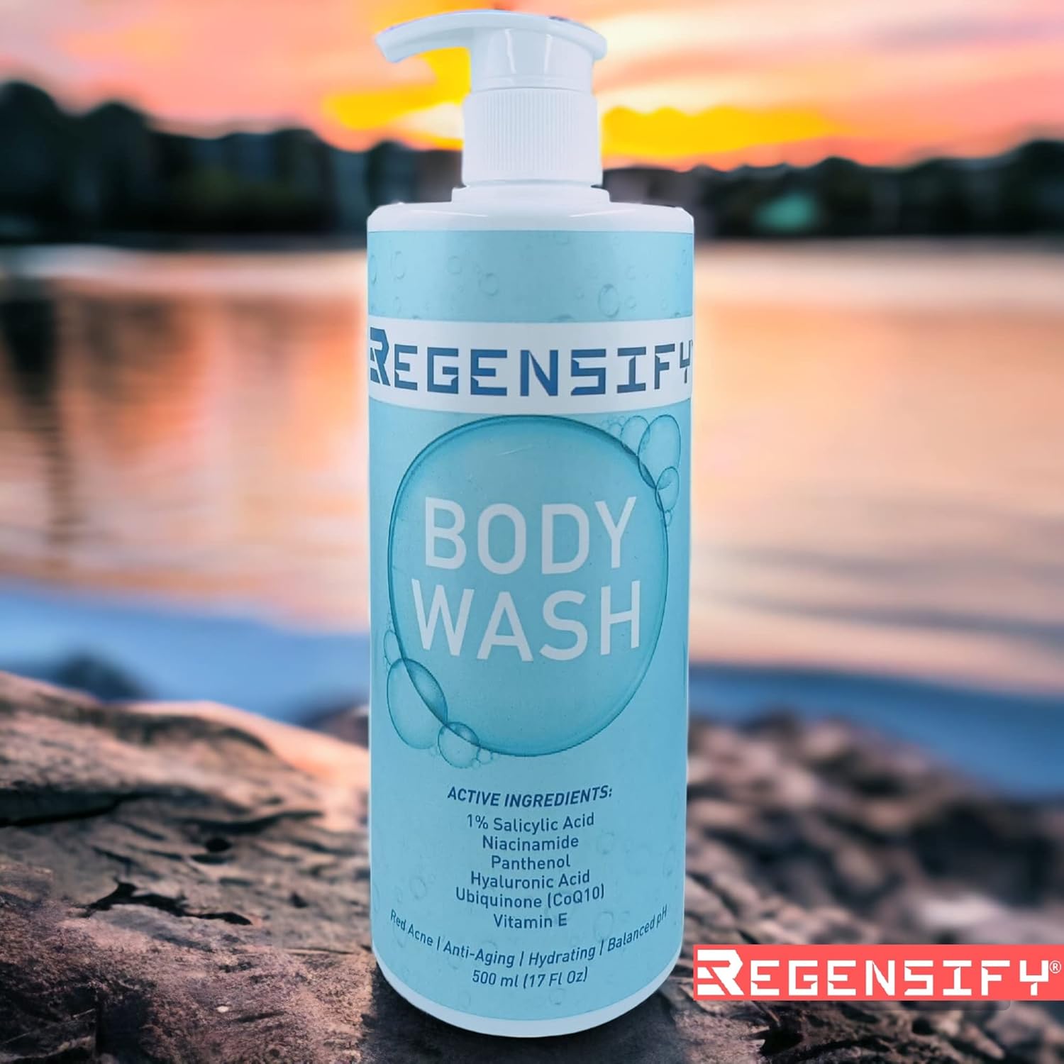 Regensify Red Acne Body Wash 500 Ml (17 Fl Oz) 1% Salicylic Acid, Niacinamide, Panthenol, Hyaluronic Acid, Coenzyme Q10 & Vitamin E - Anti Aging, Hydrating, Moisturising & Exfoliating Shower Gel