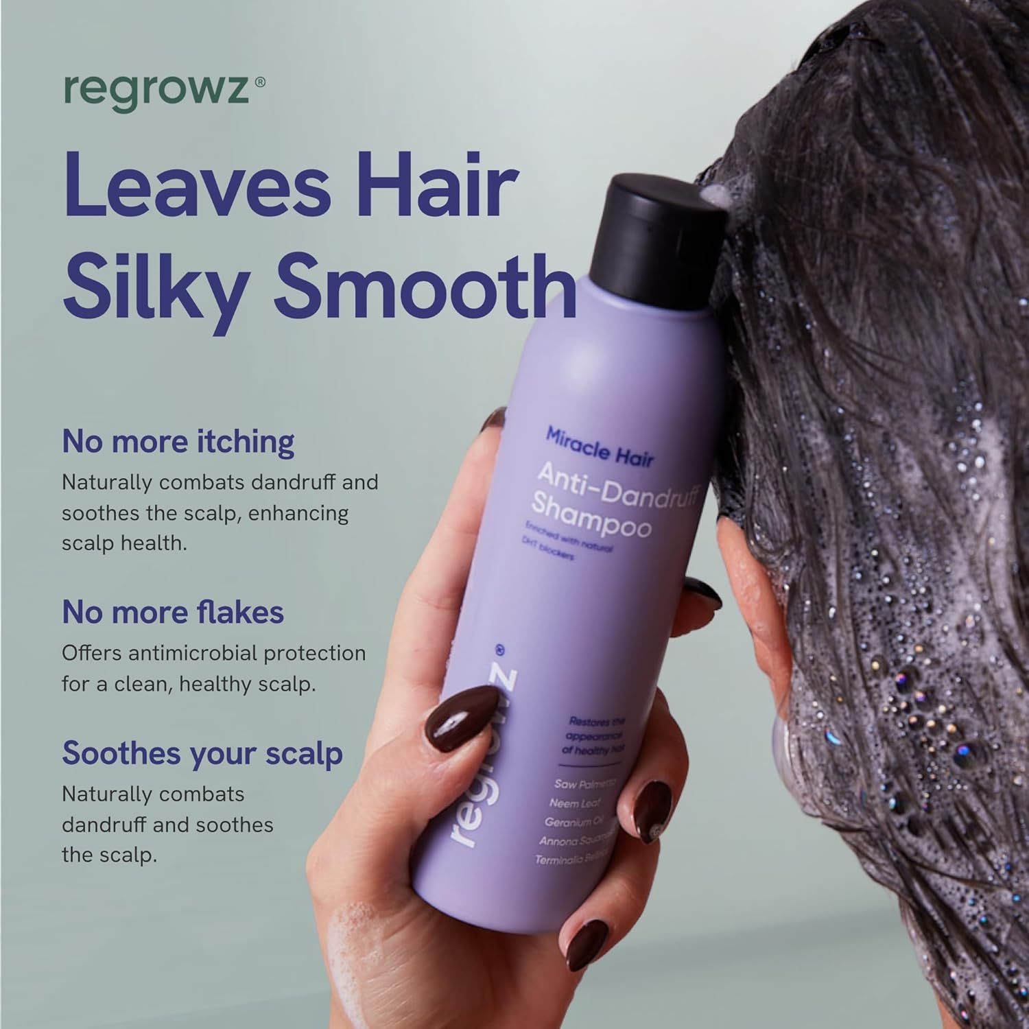 About this item REGROWZ ANTI-DANDRUFF SHAMPOO: Reduces flaking, scaling and itching caused by even stubborn dandruff RESTORE HEALTHY HAIR: Filled with effective ingredients that are proven to help fight dandruff outbreaks and help restore the scalp to a clean, fresh and healthy condition. FOR ALL TYPES OF HAIR: Can be used on colour-treated hair, dry hair, hair with highlights, bleached, greasy, curly, oily, brittle, or frizzy hair. ORGANIC AND VEGAN: Experience the beauty of nature with our vegan product, perfect for those who value healthy hair and want to enhance their natural beauty without compromise. NATURAL SHAMPOO: A gentle and eco-friendly hair care product. It's made from a special blend of plant-based ingredients that nourish and cleanse your hair naturally. Our Anti-Dandruff shampoo promotes healthy hair and a happy scalp. See more product details,REGROWZ ANTI-DANDRUFF SHAMPOO: Reduces flaking, scaling and itching caused by even stubborn dandruff,RESTORE HEALTHY HAIR: Filled with effective ingredients that are proven to help fight dandruff outbreaks and help restore the scalp to a clean, fresh and healthy condition,FOR ALL TYPES OF HAIR: Can be used on colour-treated hair, dry hair, hair with highlights, bleached, greasy, curly, oily, brittle, or frizzy hair,ORGANIC AND VEGAN: Experience the beauty of nature with our vegan product, perfect for those who value healthy hair and want to enhance their natural beauty without compromise,NATURAL SHAMPOO: A gentle and eco-friendly hair care product. It's made from a special blend of plant-based ingredients that nourish and cleanse your hair naturally. Our Anti-Dandruff shampoo promotes healthy hair and a happy scalp