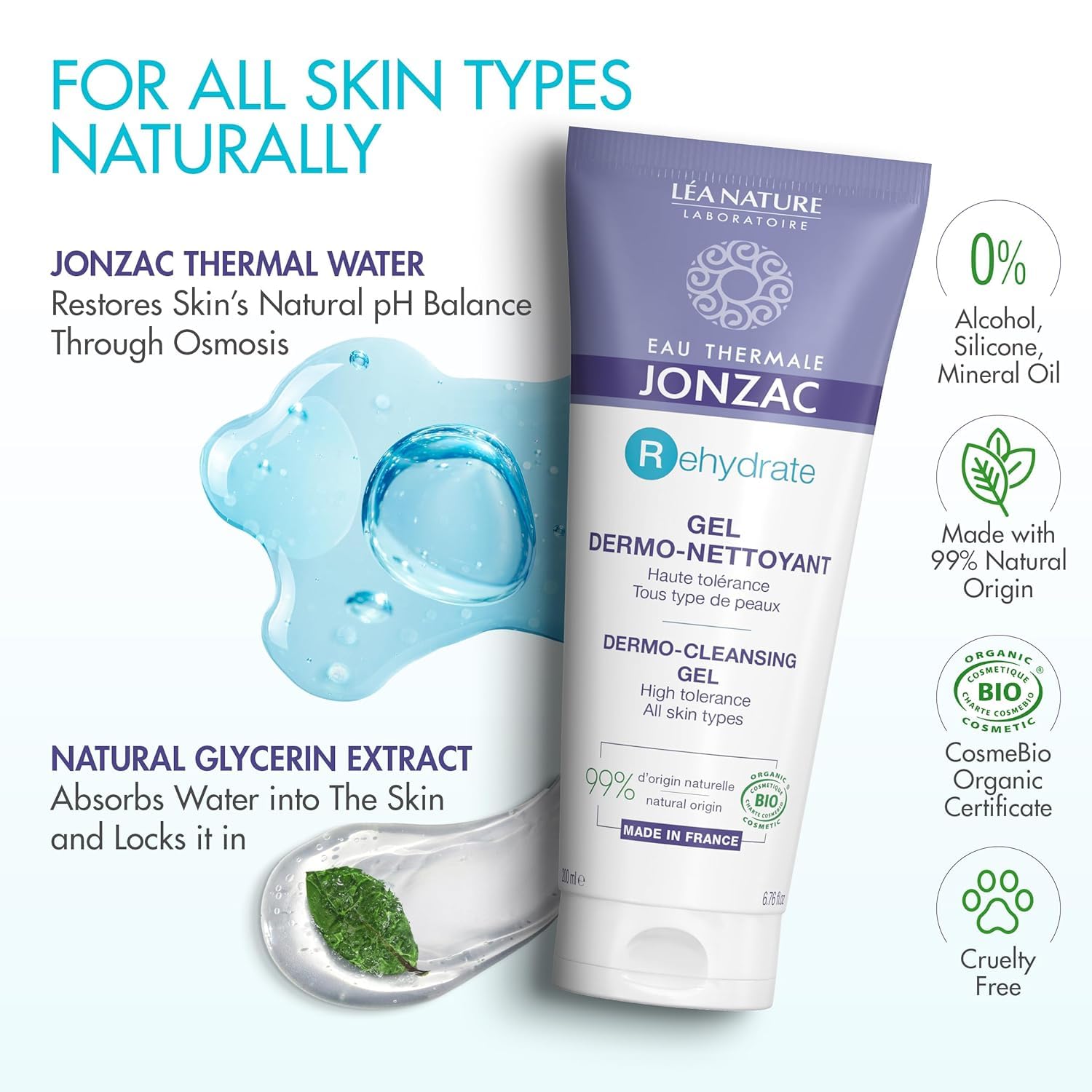 About this item Eau de Jonzac Rehydrate Dermo-Cleansing Gel 200ml with gel texture is ideal for the daily hygiene of sensitive skins, dehydrated normal to combination skins. Soap-free, its formula contains no irritant agents and removes impurities, while respecting the hydrolipidic film of the skin. Rich in Eau Thermale de Jonzac (15%), it offers anti-irritant and soothing properties. Organic certified. Hypoallergenic. Dermatologically tested. Soap-free.99% of the total ingredients are from natural origin.11% of the total ingredients are from organic farming. See more product details,Eau de Jonzac Rehydrate Dermo-Cleansing Gel 200ml with gel texture is ideal for the daily hygiene of sensitive skins, dehydrated normal to combination skins,Soap-free, its formula contains no irritant agents and removes impurities, while respecting the hydrolipidic film of the skin. Rich in Eau Thermale de Jonzac (15%), it offers anti-irritant and soothing properties,Organic certified. Hypoallergenic. Dermatologically tested. Soap-free.99% of the total ingredients are from natural origin.11% of the total ingredients are from organic farming