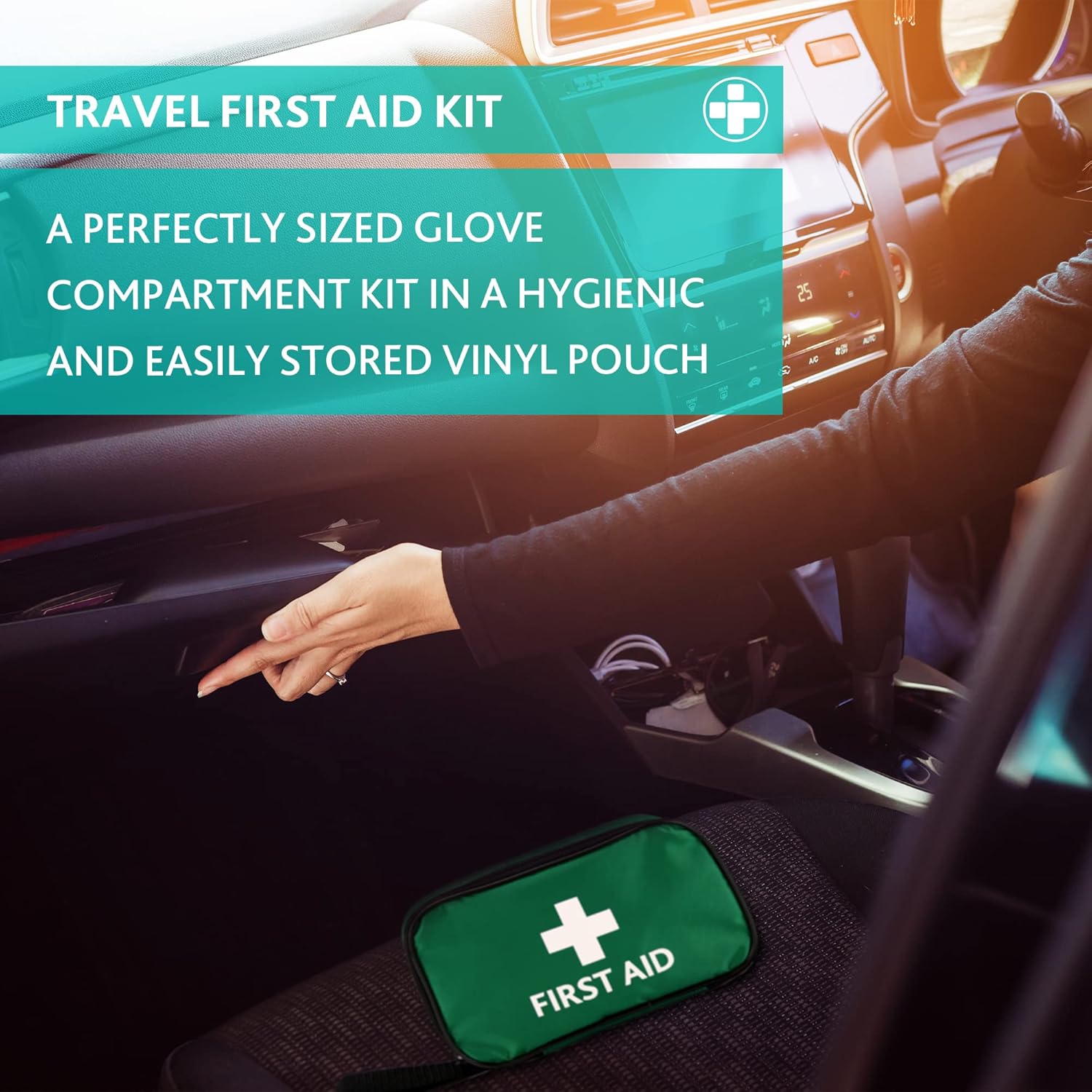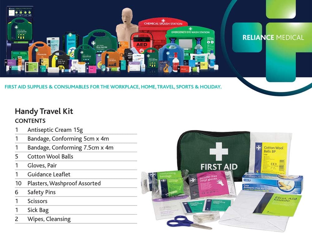 Reliance Medical - (Rel416) Handy Travel First Aid Kit, Travel Pouch With, Bandages, Cotton Wool Balls, Gloves, Plasters, Safety Pins, Scissors, Slick Bag And Cleansing Wipes (Green)