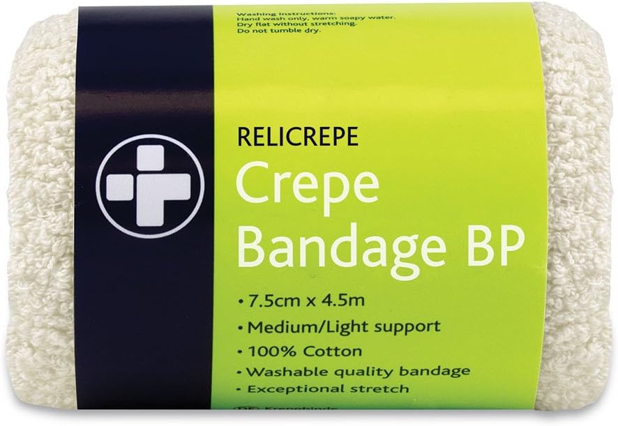 Reliance Medical White Bp Grade Cotton Relicrepe Crepe Bandage Soft, Comfortable, Medium/Light Support And Non-Sterile Bandage Designed For Sprains, Strains, And Minor Aches (7.5Cm X 4.5M, Pack Of 10)