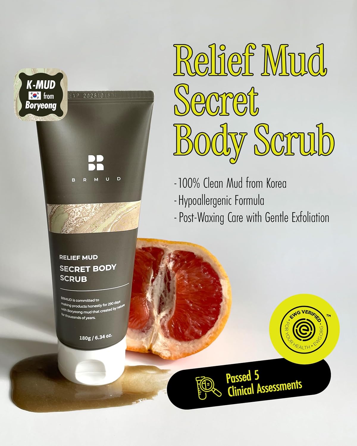 Relief Mud Secret Body Scrub | Korean Body Wash Scrub Exfoliator For Ingrown Hair & Razor Bumps | After Waxing Care Feminine Wash W/Brown Sugar | Body Wash For Sensitive Skin (6.34 Fl Oz)