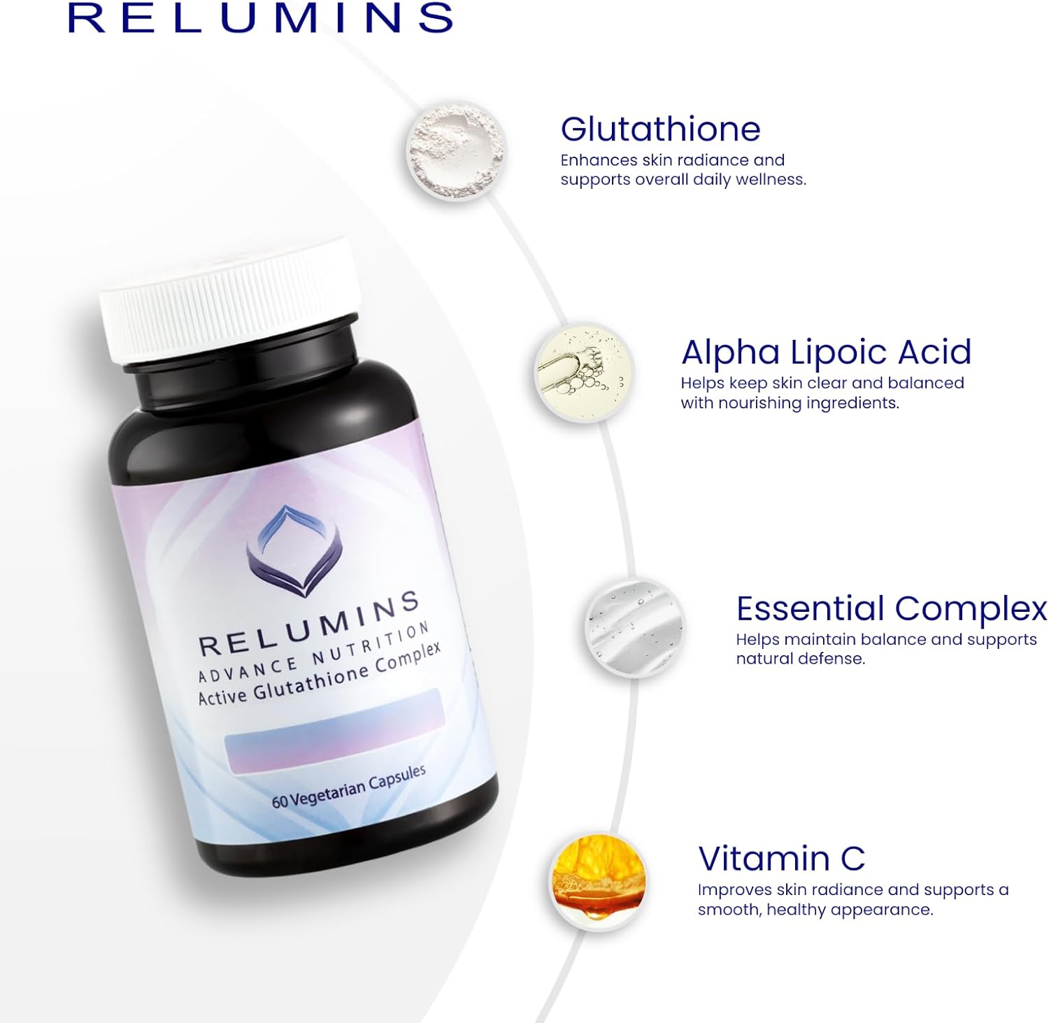 About this item 6 Times More Effective - Relumins Active Glutathione Complex is clinically shown to provide 6 times more effective Glutathione support. It delivers visible results, offering a brighter complexion and enhanced overall health with the most advanced and effective oral Glutathione formula available. The Master Antioxidant - Our Max Dose Glutathione contains 900mg of L-Glutathione per serving. Glutathione is well known for being an incredibly potent antioxidant that promotes liver function, lessens skin damage caused by free radicals, and helps combat them. It is also at the forefront of skin aesthetics, offering natural radiant skin results with zero risk of side effects. Achieve Radiant Skin and Overall Wellness - Our L-Glutathione booster, with 225mg of Alpha Lipoic Acid, naturally supports high levels of glutathione in the body, which leads to improved skin tone and enhanced overall health. Max Dose Glutathione - Unleash the combined power of 6 potent glutathione boosters which include N-Acetyl-L-Cysteine, L-Methionine, L-Glutathione, Vitamin E and B2, and Selenomethionone, in our advanced formula. This synergistic blend is meticulously crafted to maximize even skin tone, bolster absorption, stimulate production, and enhance efficacy, providing comprehensive support for radiant, glowing skin. Quality Guaranteed - Our product is meticulously crafted in a cGMP-certified laboratory, ensuring the highest standards of quality and safety. It is certified halal, meeting everyone's dietary requirements. Each bottle contains 60 vegetarian capsules. › See more product details,6 Times More Effective - Relumins Active Glutathione Complex is clinically shown to provide 6 times more effective Glutathione support. It delivers visible results, offering a brighter complexion and enhanced overall health with the most advanced and effective oral Glutathione formula available,The Master Antioxidant - Our Max Dose Glutathione contains 900mg of L-Glutathione per serving. Glutathione is well known for being an incredibly potent antioxidant that promotes liver function, lessens skin damage caused by free radicals, and helps combat them. It is also at the forefront of skin aesthetics, offering natural radiant skin results with zero risk of side effects,Achieve Radiant Skin and Overall Wellness - Our L-Glutathione booster, with 225mg of Alpha Lipoic Acid, naturally supports high levels of glutathione in the body, which leads to improved skin tone and enhanced overall health,Max Dose Glutathione - Unleash the combined power of 6 potent glutathione boosters which include N-Acetyl-L-Cysteine, L-Methionine, L-Glutathione, Vitamin E and B2, and Selenomethionone, in our advanced formula. This synergistic blend is meticulously crafted to maximize even skin tone, bolster absorption, stimulate production, and enhance efficacy, providing comprehensive support for radiant, glowing skin,Quality Guaranteed - Our product is meticulously crafted in a cGMP-certified laboratory, ensuring the highest standards of quality and safety. It is certified halal, meeting everyone's dietary requirements. Each bottle contains 60 vegetarian capsules