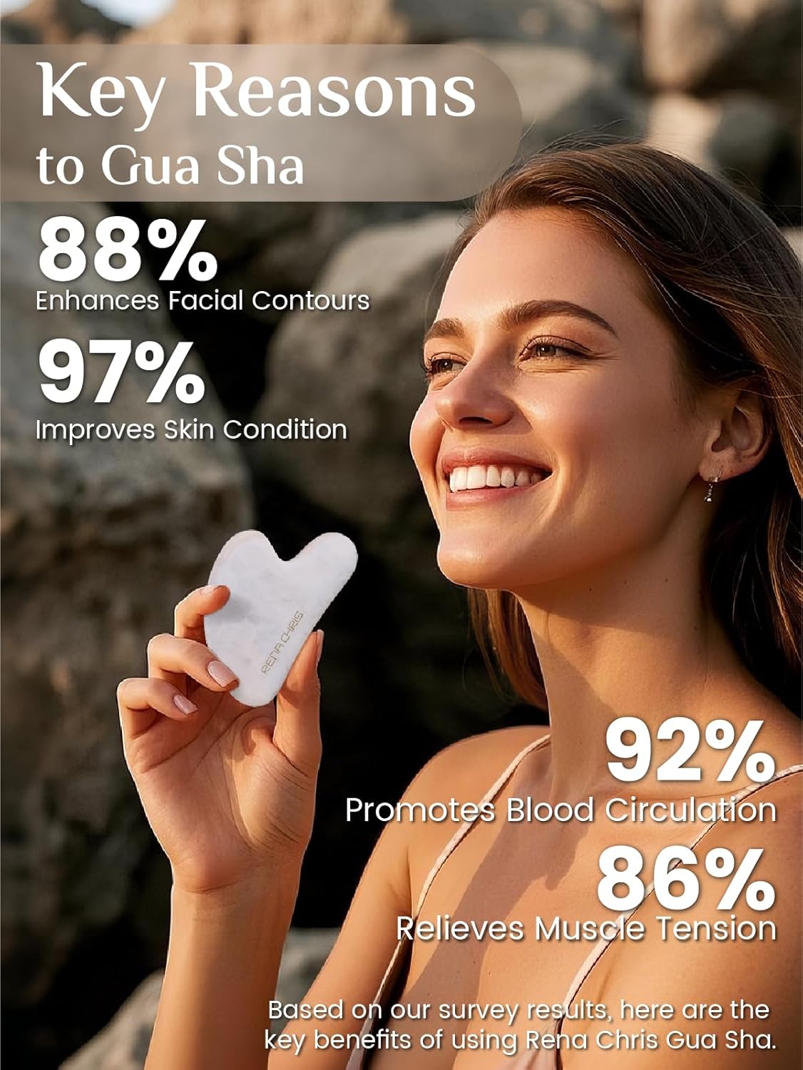 BENEFITS OF GUASHA: Experience the power of this traditional Chinese therapy—boosts blood circulation, reduces puffiness, sculpts your jawline, nourishes your skin, eases tension, and supports lymphatic drainage for a revitalized look