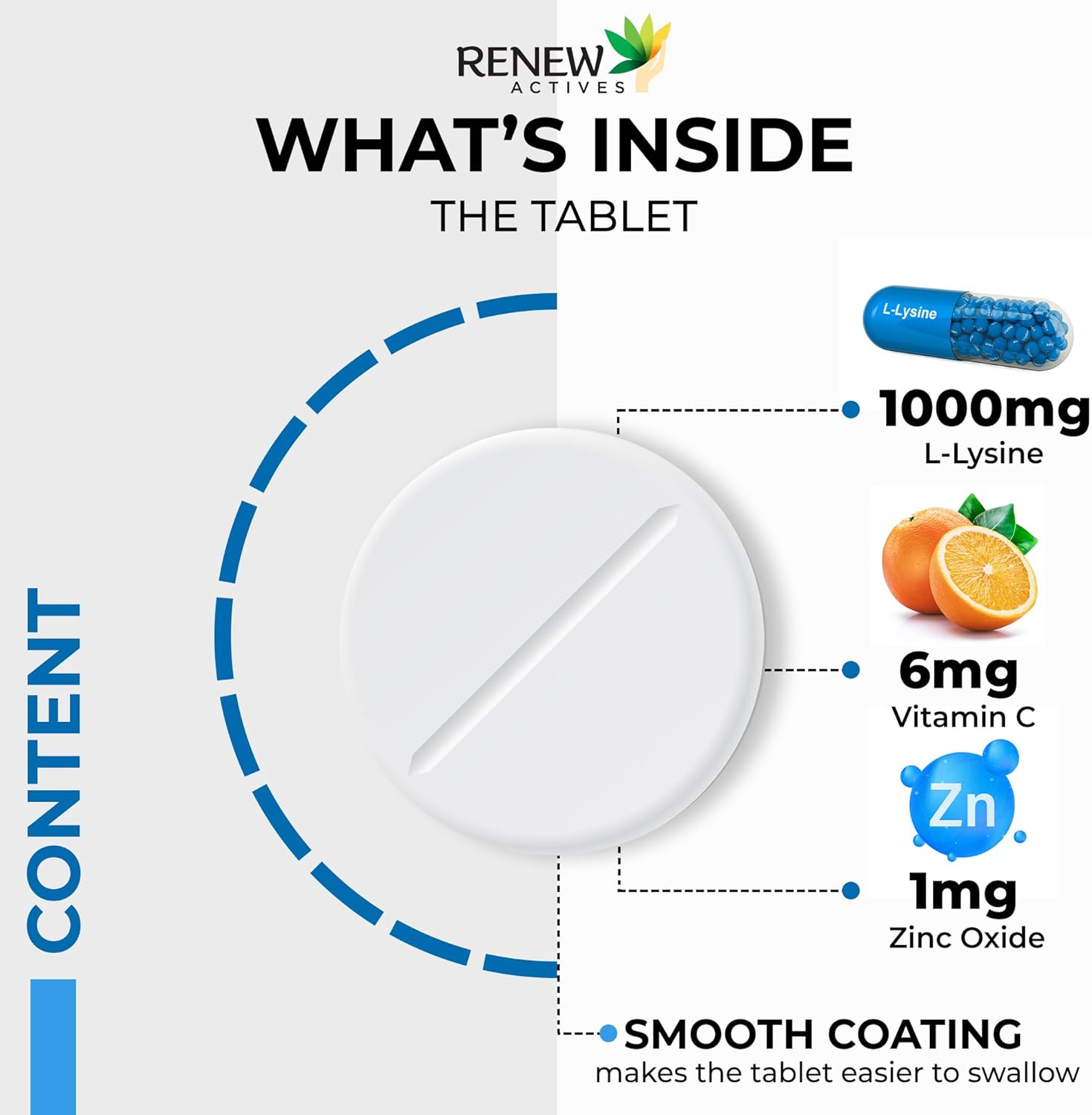 Renew Actives L-Lysine 1000 Mg Per Serving With Zinc & Vitamin C – Supports Immune Function, Collagen Formation, Antioxidant Support, & Healthy Skin, Hair, & Nails – Made In Canada – 60 Tablets