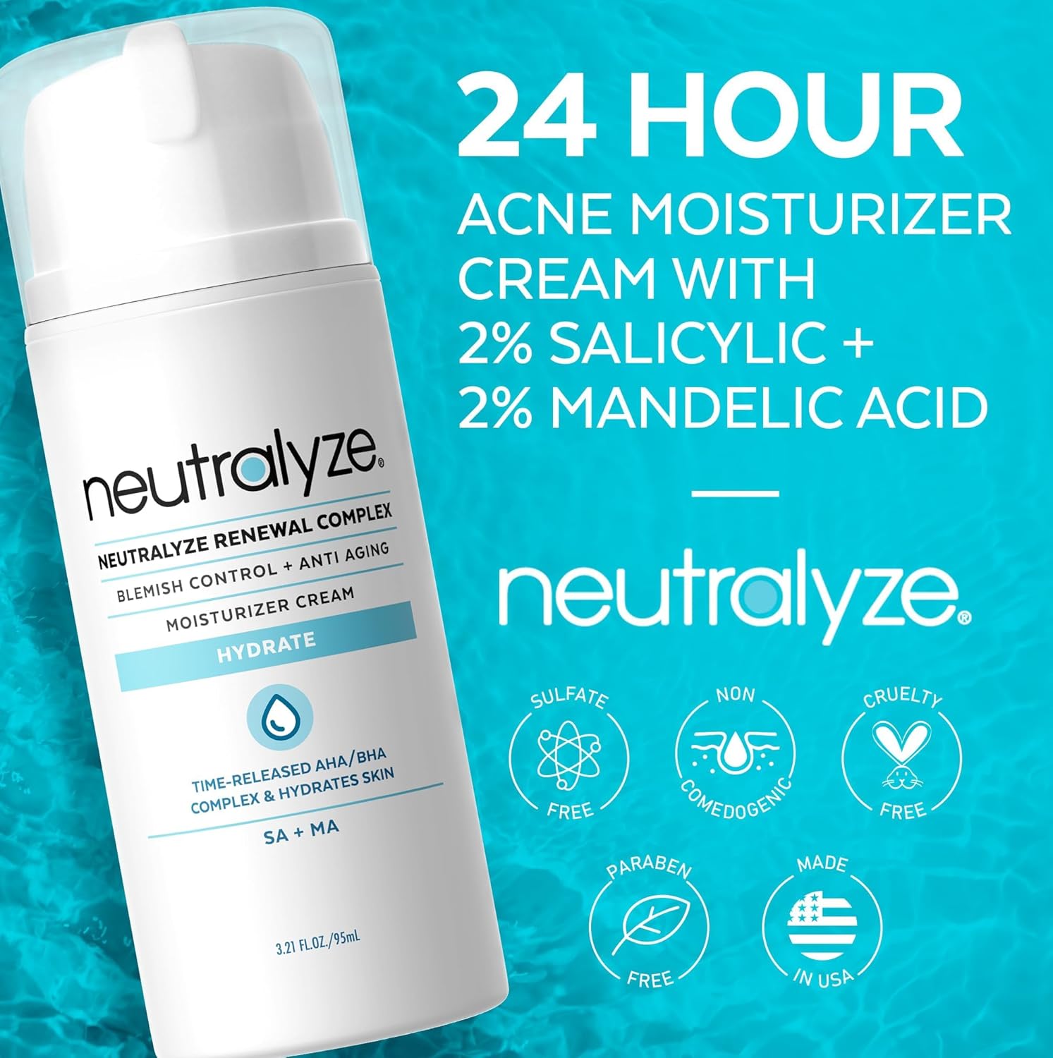 About this item UNSCENTED, TIME RELEASED AHA + BHA MOISTURIZER FOR ACNE: Multi-tasking face moisturizer cream for acne prone skin & acne cream (large 3.4 oz/90+ day supply). Perfect for dry, oily and combination skin. This maximum strength acne moisturizer contains time-released, medical grade 2% salicylic acid & mandelic acid to remove acne, increase cellular turnover and gently exfoliate. Apply up to 2X daily, safe to use before applying makeup. NON COMEDOGENIC FORMULATION WITH ADVANCED OIL CONTROL TECHNOLOGY: Contains patented advanced oil control technology to quickly absorb into skin and deeply penetrate, removing excess oil trapped in pores. Improves skin elasticity for fewer fine lines & wrinkles. Gently fades acne scars over time. FAST ABSORBING, NON-GREASY ACNE LOTION: This multi-purpose, hydrating facial moisturizer cream for acne prone skin goes on clean and instantly hydrates skin. Beautifully lightweight and formulated to absorb quickly so you can layer SPF and/or makeup as needed. Suitable for oily, dry or combination skin types. Perfect for women and men, adults and teens. FIGHTS ACNE, HYDRATES & PREVENT FUTURE BREAKOUTS: This multi-functional, oil free acne moisturizer cream provides an all-in-one solution for several concerns. Combination daytime moisturizer & acne cream with anti aging skincare benefits. Safe for sensitive skin. LOVE IT OR LET US KNOW: As a family-owned business, your satisfaction is our guarantee. Neutralyze is a dermatologist-recommended treatment for acne vulgaris and related skin issues. USA-made in a certified cGMP/SOP compliant facility, 100% cruelty-free (never tested on animals). No parabens or sulfates. › See more product details,UNSCENTED, TIME RELEASED AHA + BHA MOISTURIZER FOR ACNE: Multi-tasking face moisturizer cream for acne prone skin & acne cream (large 3.4 oz/90+ day supply). Perfect for dry, oily and combination skin. This maximum strength acne moisturizer contains time-released, medical grade 2% salicylic acid & mandelic acid to remove acne, increase cellular turnover and gently exfoliate. Apply up to 2X daily, safe to use before applying makeup,NON COMEDOGENIC FORMULATION WITH ADVANCED OIL CONTROL TECHNOLOGY: Contains patented advanced oil control technology to quickly absorb into skin and deeply penetrate, removing excess oil trapped in pores. Improves skin elasticity for fewer fine lines & wrinkles. Gently fades acne scars over time,FAST ABSORBING, NON-GREASY ACNE LOTION: This multi-purpose, hydrating facial moisturizer cream for acne prone skin goes on clean and instantly hydrates skin. Beautifully lightweight and formulated to absorb quickly so you can layer SPF and/or makeup as needed. Suitable for oily, dry or combination skin types. Perfect for women and men, adults and teens,FIGHTS ACNE, HYDRATES & PREVENT FUTURE BREAKOUTS: This multi-functional, oil free acne moisturizer cream provides an all-in-one solution for several concerns. Combination daytime moisturizer & acne cream with anti aging skincare benefits. Safe for sensitive skin,LOVE IT OR LET US KNOW: As a family-owned business, your satisfaction is our guarantee. Neutralyze is a dermatologist-recommended treatment for acne vulgaris and related skin issues. USA-made in a certified cGMP/SOP compliant facility, 100% cruelty-free (never tested on animals). No parabens or sulfates