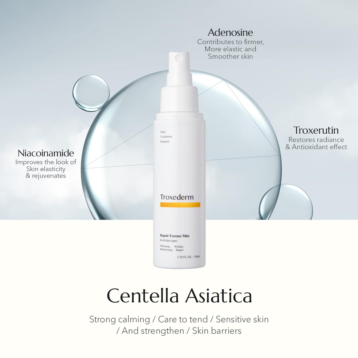 About this item Niacinamide-infused Youthfulness : Our TROXDERM Repair Essence Face Mist is infused with niacinamide, which targets fine lines, evens skin tone, reduces sebum production, and protects from external stressors, providing you with youthful and radiant skin in one convenient niacinamide face mist. Calming & Soothing Facial Mist : Experience instant relief from heat exposure with our soothing face mist, formulated to calm and protect the skin from environmental stressors such as sun exposure, intense workouts, and electronic device heat, leaving your skin refreshed and revitalized. Hydrating face mist : The formula of our facial mist, featuring ingredients such as Centella asiatica and niacinamide, replenishes moisture levels. Clinically proven to boost the skin’s moisture barrier, it increases skin moisturization by 157%, ensuring your skin remains hydrated throughout the day. On-the-go Solution : Conveniently sized at 3.38 Fl.oz and 1.01 Fl. Oz, our travel face mist ensures you can hydrate and rejuvenate your skin wherever you are. Perfect for those seeking a portable hydrating face mist for travel or on-the-go use. Multi-benefit Toner Mist: Our face mist is formulated to soothe, tone and hydrate and combines the benefits of niacinamide, troxerutin, and Centella asiatica extracts in one comprehensive toner mist. It offers a complete skincare solution for all your hydration, revitalization, and soothing needs. See more product details,Niacinamide-infused Youthfulness : Our TROXDERM Repair Essence Face Mist is infused with niacinamide, which targets fine lines, evens skin tone, reduces sebum production, and protects from external stressors, providing you with youthful and radiant skin in one convenient niacinamide face mist,Calming & Soothing Facial Mist : Experience instant relief from heat exposure with our soothing face mist, formulated to calm and protect the skin from environmental stressors such as sun exposure, intense workouts, and electronic device heat, leaving your skin refreshed and revitalized,Hydrating face mist : The formula of our facial mist, featuring ingredients such as Centella asiatica and niacinamide, replenishes moisture levels. Clinically proven to boost the skin’s moisture barrier, it increases skin moisturization by 157%, ensuring your skin remains hydrated throughout the day,On-the-go Solution : Conveniently sized at 3.38 Fl.oz and 1.01 Fl. Oz, our travel face mist ensures you can hydrate and rejuvenate your skin wherever you are. Perfect for those seeking a portable hydrating face mist for travel or on-the-go use,Multi-benefit Toner Mist: Our face mist is formulated to soothe, tone and hydrate and combines the benefits of niacinamide, troxerutin, and Centella asiatica extracts in one comprehensive toner mist. It offers a complete skincare solution for all your hydration, revitalization, and soothing needs