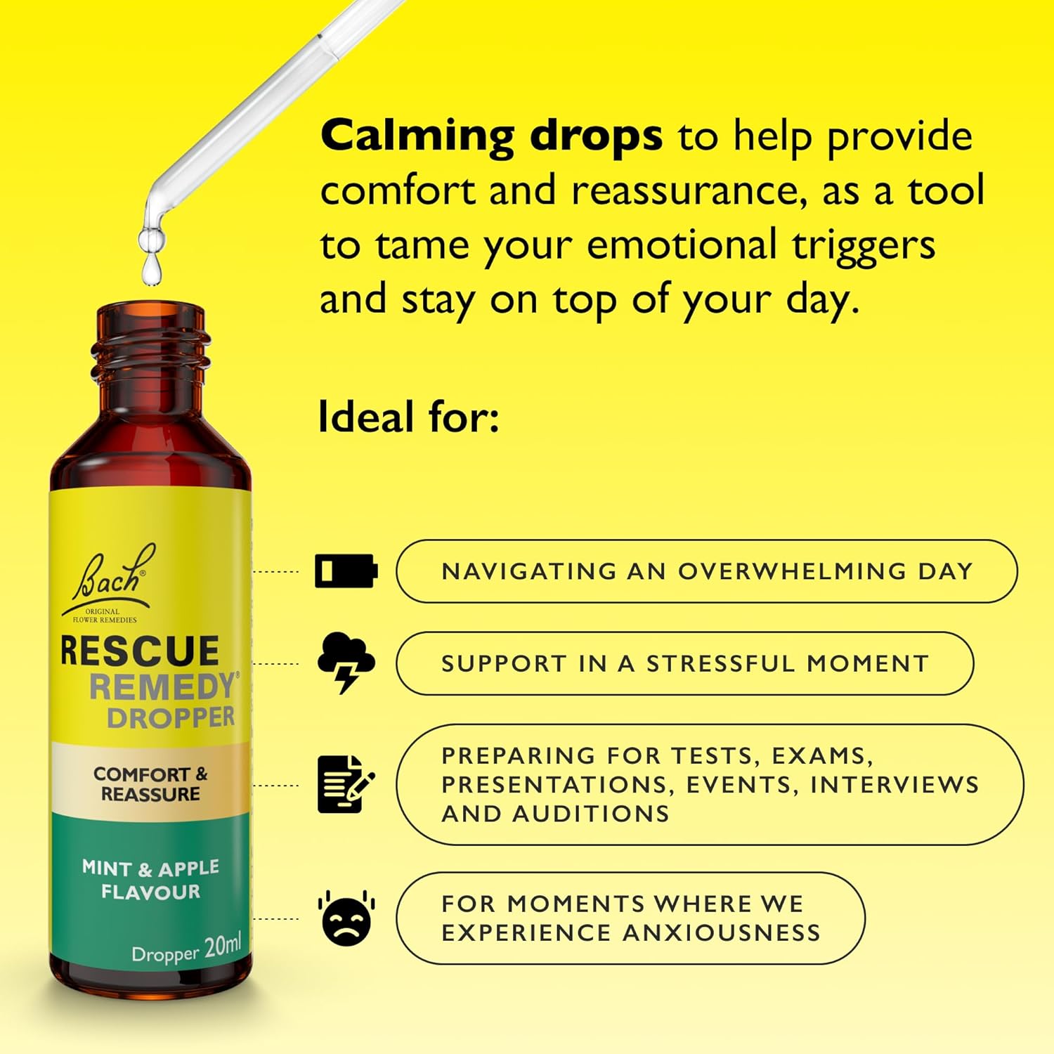 Rescue Remedy Dropper 20Ml (Chocolate & Peppermint) Comfort & Reassurance, Alcohol Free, Natural Emotional Wellness Day Support, Flower Essence Vegan Formula, Travel, Exams