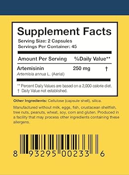 3 > Contains 250mg of artemisinin extract from worm wood per 2-capsule serving