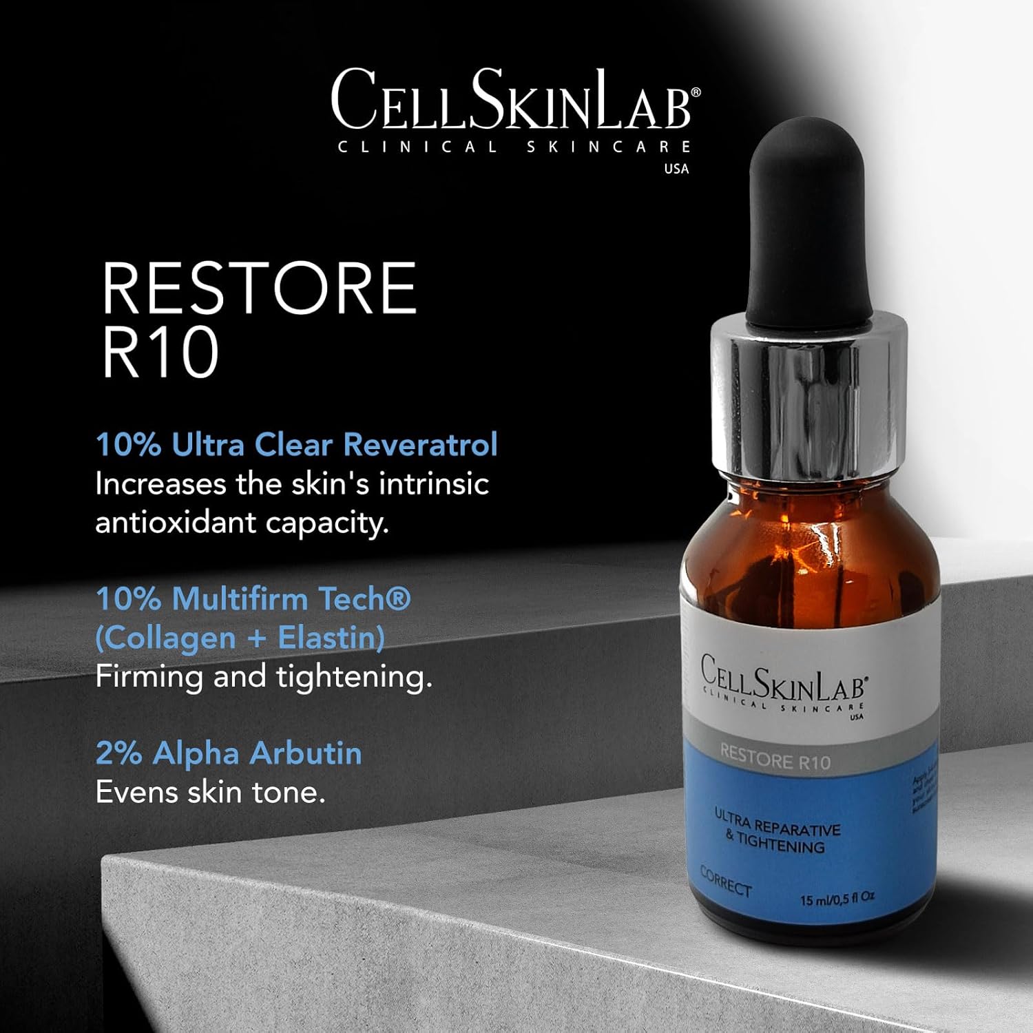 Restoring And Tightening Serum By Cellskinlab – Restore R10 - Reparative Skincare For Damaged Skin – Antiaging Solution With Ultra Clear Resveratrol 10%, Collagen And Elastin