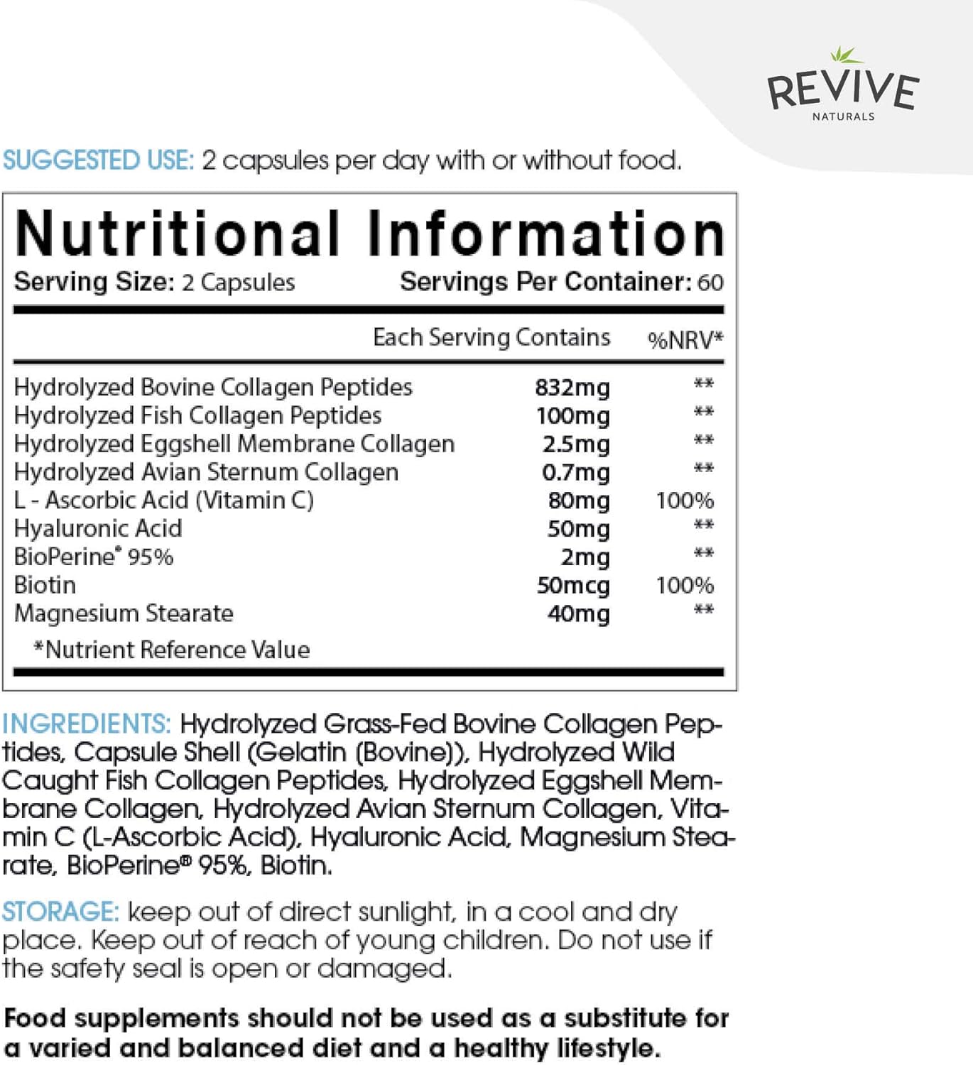 Revive Naturals Multi Collagen Protein Capsules - Types I, Ii, Iii, V & X - Hydrolysed Grass Fed Bovine, Wild Caught Marine & Free-Range Chicken, Made With Hyaluronic Acid & Vitamin C, 120 Caps