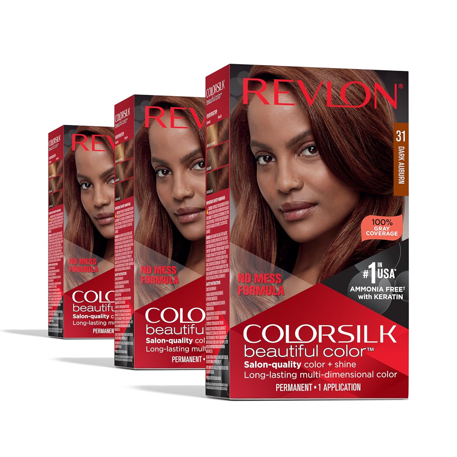 Revlon Colorsilk Beautiful Color Permanent Hair Color, Long-Lasting High-Definition Color, Shine & Silky Softness With 100% Gray Coverage, Ammonia Free, 31 Dark Auburn, 3 Pack