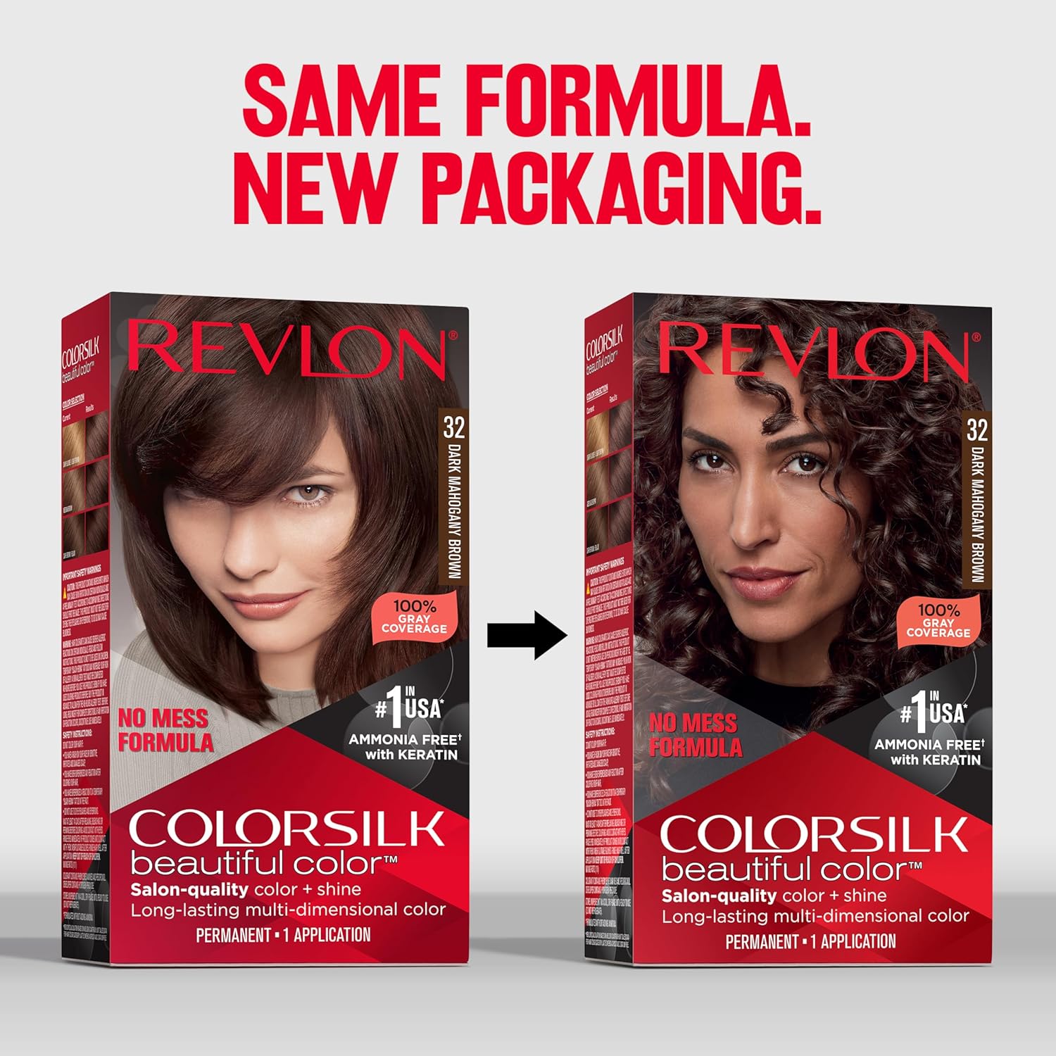 Revlon Colorsilk Beautiful Color Permanent Hair Color, Long-Lasting High-Definition Color, Shine & Silky Softness With 100% Gray Coverage, Ammonia Free, 32 Dark Mahogany Brown, 3 Pack