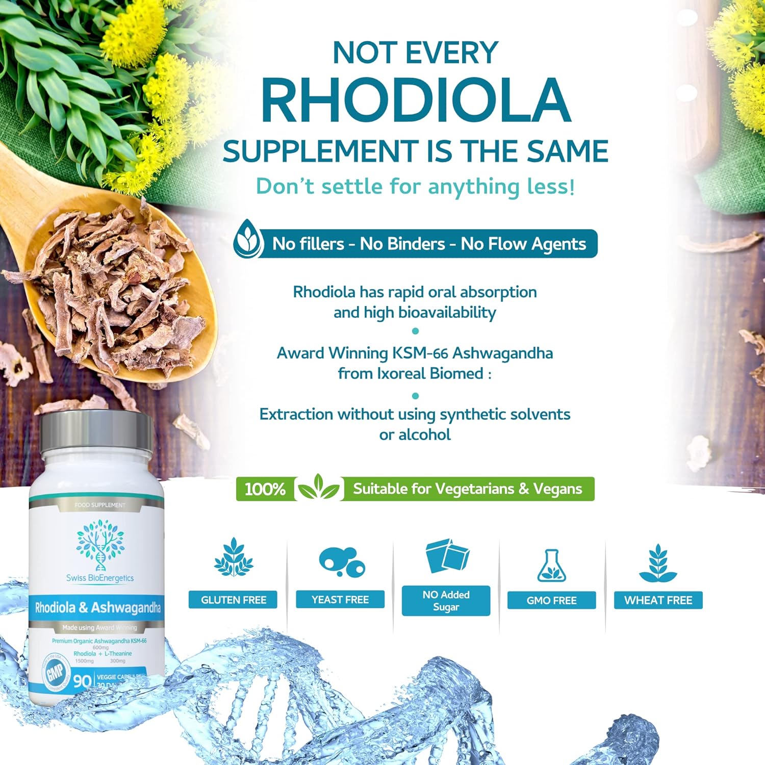? HIGHEST POTENCY – Swiss BioEnergetics Rhodiola & Ashwagandha with L-Theanine contains 600mg of Organic KSM-66 Ashwagandha extract per serving, produced using a unique proprietary extraction process that preserves the natural potency of Ashwagandha. The Rhodiola extract is standardised to at least 3% Rosavins & 1% Salidrosides