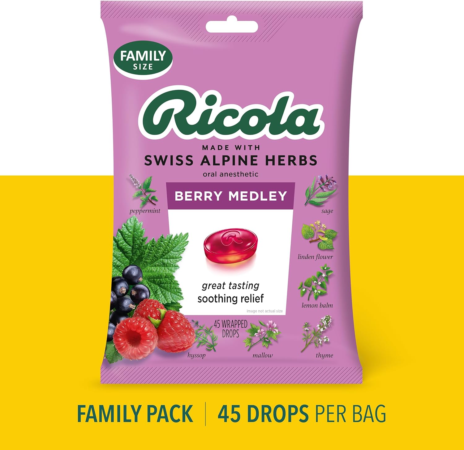 Ricola Berry Medley throat drops blend the juicy ripe sweetness of raspberries, bilberries and black currants with the subtle hint of our signature Alpine herbs for a taste that simply can’t be beat. Boldly balanced to bring delicious delight to your daily routine, these tasty soothing drops are a treat to be treasured. For nearly a century, Ricola has been helping throats around the world feel better