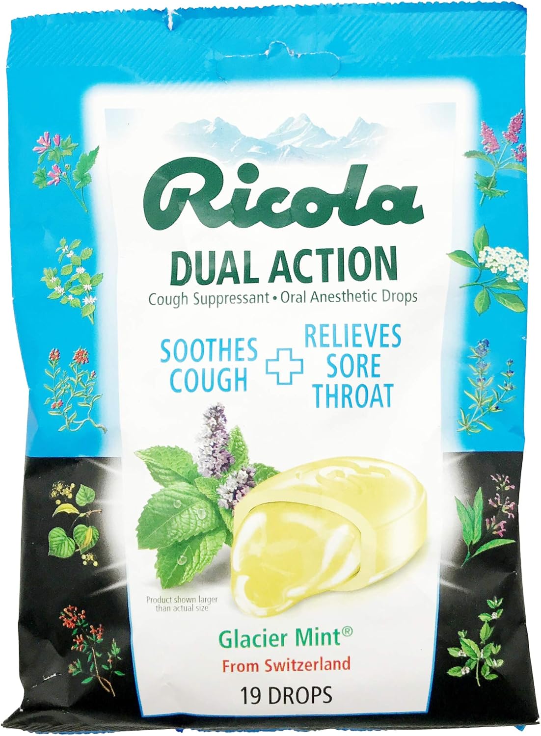 Ricola Dual Action Glacier Mint cough drops provide effective cough relief and sore throat relief. Our natural menthol and soothing syrup center combine to give you fast, safe relief you can trust, plus great taste. Get the relief of a cough drop and sore throat drop in one. For nearly a century, Ricola has been helping throats around the world feel better