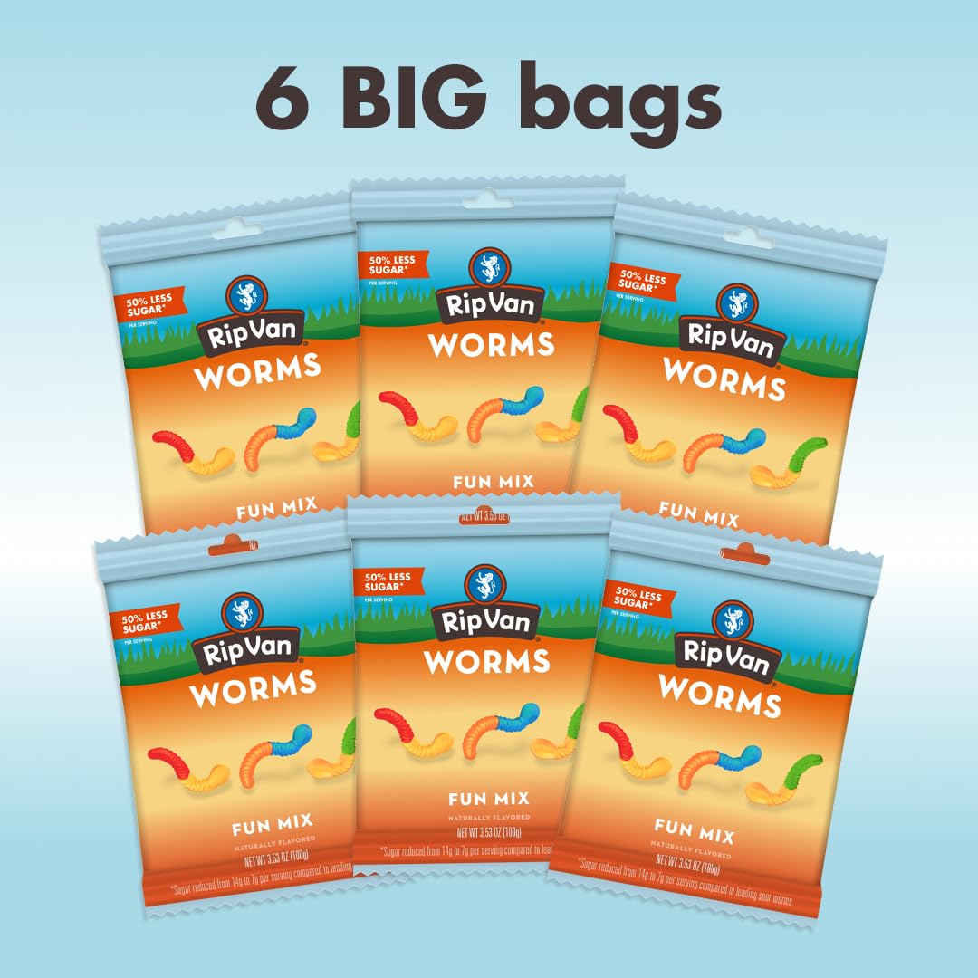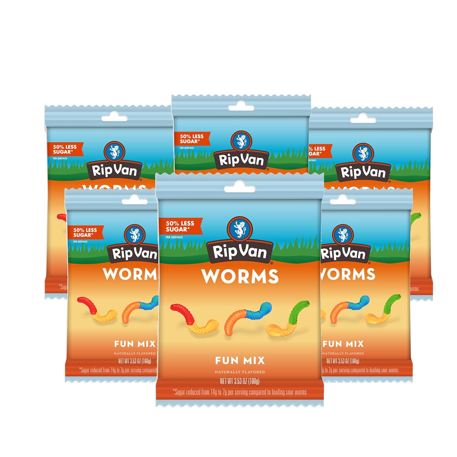 Rip Van Gummy Worms Mixed Fruit - Low Sugar Gummies With Real Fruit - 3.53Oz Bags 6 Ct