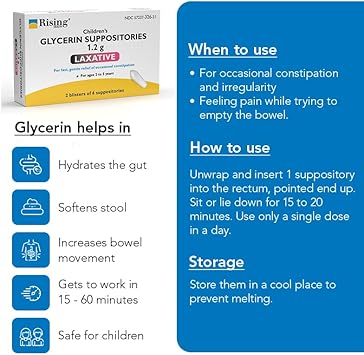About this item FAST-ACTING LAXATIVE: Get reliable, occasional constipation relief for your children with Rising Health Fast Relief Laxative Suppositories. Containing Glycerin USP, 1.2g, this laxative often works in 15 minutes to 1 hour for effective relief of constipation. See more product details,FAST-ACTING LAXATIVE: Get reliable, occasional constipation relief for your children with Rising Health Fast Relief Laxative Suppositories. Containing Glycerin USP, 1.2g, this laxative often works in 15 minutes to 1 hour for effective relief of constipation