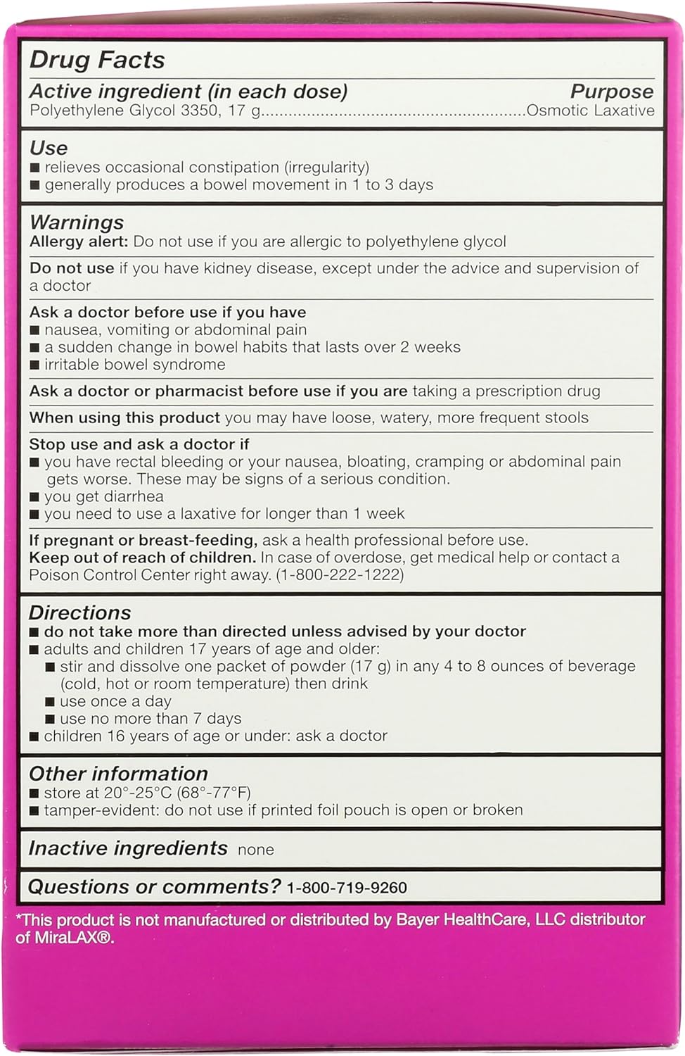 STOOL SOFTENERS FOR CONSTIPATION: Rite Aid Laxative Powder Packets help soften stools to allow your body for a gentle release and ease the stool through your colon within 1 to 3 days10 LAXATIVE POWDER TRAVEL PACKETS: Great for on-the-go, the Rite Aid Laxative Powder Packets are pre-measured in single dose packets containing 0.5 oz (17 grams) of powderSUGAR-FREE, GRIT FREE & UNFLAVORED POWDER: Easily open the packet and mix the flavorless laxative powder with 4 to 8 ounces of any beverage - hot, cold, or room temperature. Stir to disolve the laxative powder into your drink and enjoy a grit-free drink with no additional sugars from the powderOSMOTIC LAXATIVE: Specially formulated to hydrate and soften stools to unblock your digestive system without harsh side effects like bloating, cramps, or gasTRUSTED BRAND SINCE 1962: We hope you continue to choose Rite Aid first for your everyday health and wellness needs. Our mission is to improve the health and wellness of our communities and provide our customers with the best products, services, and advice
