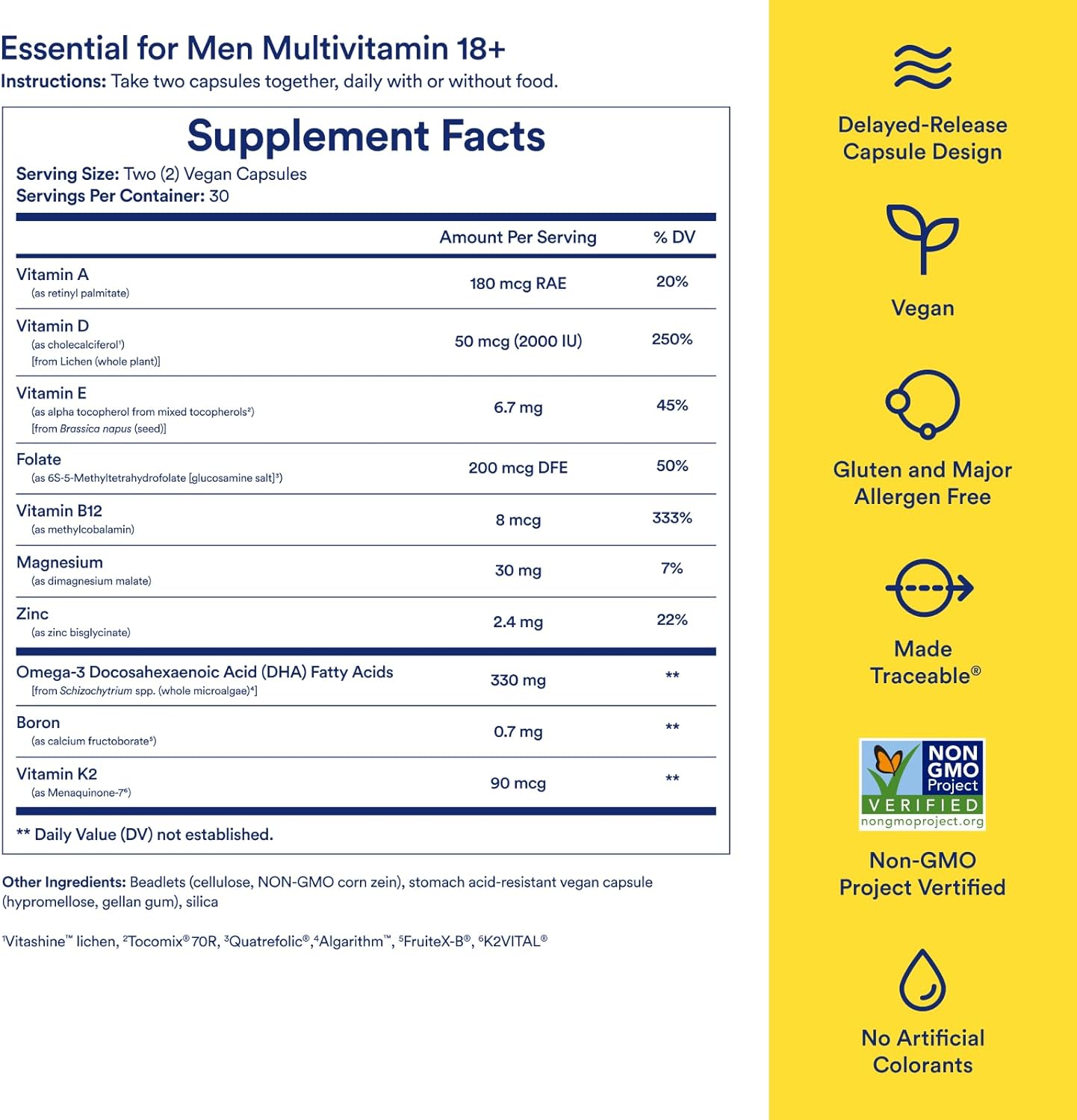 Made Traceable: Our world-class scientists scoured the globe for high quality ingredients. Our Essential Multivitamins for Men 18+ formula includes Vitamin D3 made from sustainably-sourced lichen found in the UK - for bone support and Omega-3 DHA from microalgae discovered in Nova Scotia. Additionally, our Synbiotic formula includes Prebiotics PreforPro from Georgia and Postbiotics Butyrate (as Tributyrin) from Spain