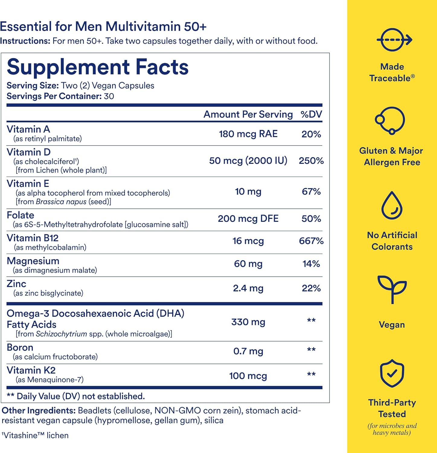 MADE TRACEABLE: Our world-class scientists scoured the globe for high quality ingredients when formulating Essential for Men Multivitamin 50+. Our formula includes Vitamin D3 made from sustainably-sourced lichen found in the UK - for bone support, Vitamin B12 in a biologically-active form from Connecticut - for brain support, Vitamin A in a form the body can efficiently utilize, from Switzerland - for immune support, and Omega-3 DHA from microalgae discovered in Nova Scotia - for heart support