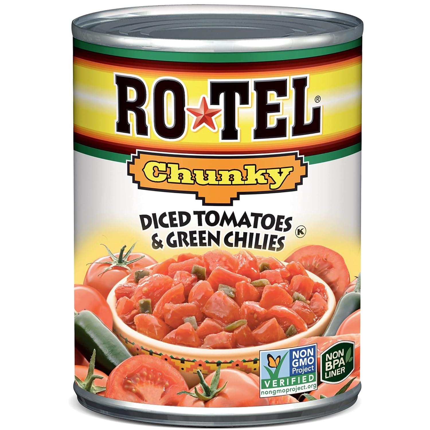 Take your favorite recipe to a bold new level with RO*TEL Chunky Diced Tomatoes and Green Chilies10Seasoned tomatoes, fierce green chilies and spice in RO*TEL Chunky Diced Tomatoes and Green Chilies turn bland chili recipes into something bold10Combine RO*TEL Chunky Diced Tomatoes and Green Chilies with chili, soups, or queso, and banish the bland10Make chili night memorable with RO*TEL Chunky Diced Tomatoes and Green Chilies10RO*TEL Chunky Diced Tomatoes and Green Chilies contains 25 calories per serving10Take your favorite recipe to a bold new level with RO*TEL Chunky Diced Tomatoes and Green Chilies. Seasoned tomatoes, fierce green chilies and spice in RO*TEL Chunky Diced Tomatoes and Green Chilies turn bland chili recipes into something bold. Combine RO*TEL Chunky Diced Tomatoes and Green Chilies with chili, soups, or queso, and banish the bland. Make chili night memorable with RO*TEL Chunky Diced Tomatoes and Green Chilies. RO*TEL Chunky Diced Tomatoes and Green Chilies contain 25 calories per serving. Don't make compromises with your meals. Embrace the bold with the fresh taste of RO*TEL, the Bite with Bite