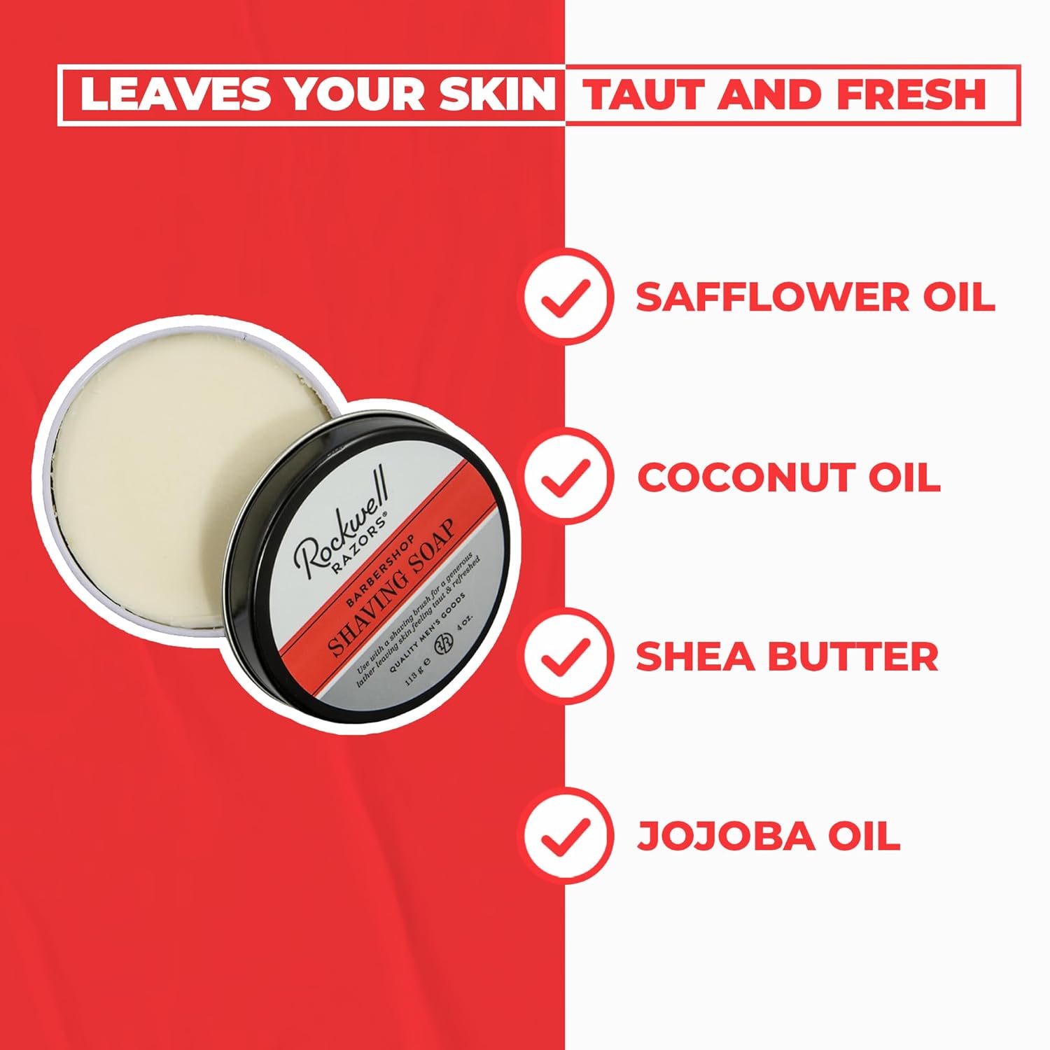 About this item WHY ROCKWELL SHAVING SOAP - Based on our years on experience improving menâs shaves, we formulated this Shave Soap to build a protective, rich lather supported by natural, premium ingredients. FOR ALL SKIN TYPES - This is the ultimate Shave Soap for those with sensitive skin, thick facial hair, or anything in between who are looking to protect their skin from nicks, cuts, tugging, ingrown hairs, or razor bumps. PREMIUM PROTECTIVE INGREDIENTS - Our all-natural coconut oil and wheat protein will moisturize and fortify your skin and stubble for a painless shave, while our shea butter will soothe your skin to ensure a smooth shave that just might be the best youâve ever had. CLASSIC BARBERSHOP SCENT - With notes of leather, neroli, anise and cedar, our Rockwell Barbershop Fragrance will take you back in time to a classic American barbershop. We guarantee youâll love the scent.  See more product details,WHY ROCKWELL SHAVING SOAP - Based on our years on experience improving menâs shaves, we formulated this Shave Soap to build a protective, rich lather supported by natural, premium ingredients,FOR ALL SKIN TYPES - This is the ultimate Shave Soap for those with sensitive skin, thick facial hair, or anything in between who are looking to protect their skin from nicks, cuts, tugging, ingrown hairs, or razor bumps,PREMIUM PROTECTIVE INGREDIENTS - Our all-natural coconut oil and wheat protein will moisturize and fortify your skin and stubble for a painless shave, while our shea butter will soothe your skin to ensure a smooth shave that just might be the best youâve ever had,CLASSIC BARBERSHOP SCENT - With notes of leather, neroli, anise and cedar, our Rockwell Barbershop Fragrance will take you back in time to a classic American barbershop. We guarantee youâll love the scent