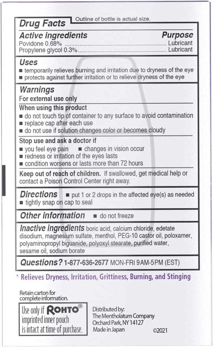Rohto Dry-Aid Eye Relief Lubricant Eye Drops, 0.34 Ounce, 2 Count,COOLING, HYDRATING EYE DROPS: Rohto Dry Aid Lubricating Eye Drops with dual lubricants are designed to relieve 5 dry eye symptoms, including burning, stinging, grittiness, dryness, and irritation,FAST-ACTING DRY EYE RELIEF: Rohto Dry Aid eye drops provide quick, non-blurring relief from dry, irritated eyes; safe for contact lens wearers (when used as directed),ADVANCED LUBRICATION: Our proprietary Liquid Shield Technology works like real tears to restore and lock in moisture while repairing all layers of the natural tear film for superior comfort,12-HOUR RELIEF: Rohto Dry Aid Lubricant Eye Drops are BAK-free and offer long-lasting hydration that soothes eyes for up to 12 hours for extended comfort and relief from dry eye symptoms; Also available in preservative-free single use vials,TRUSTED BRAND: Trust Rohto - A global leading eye care brand to bring you innovative solutions for your eye health