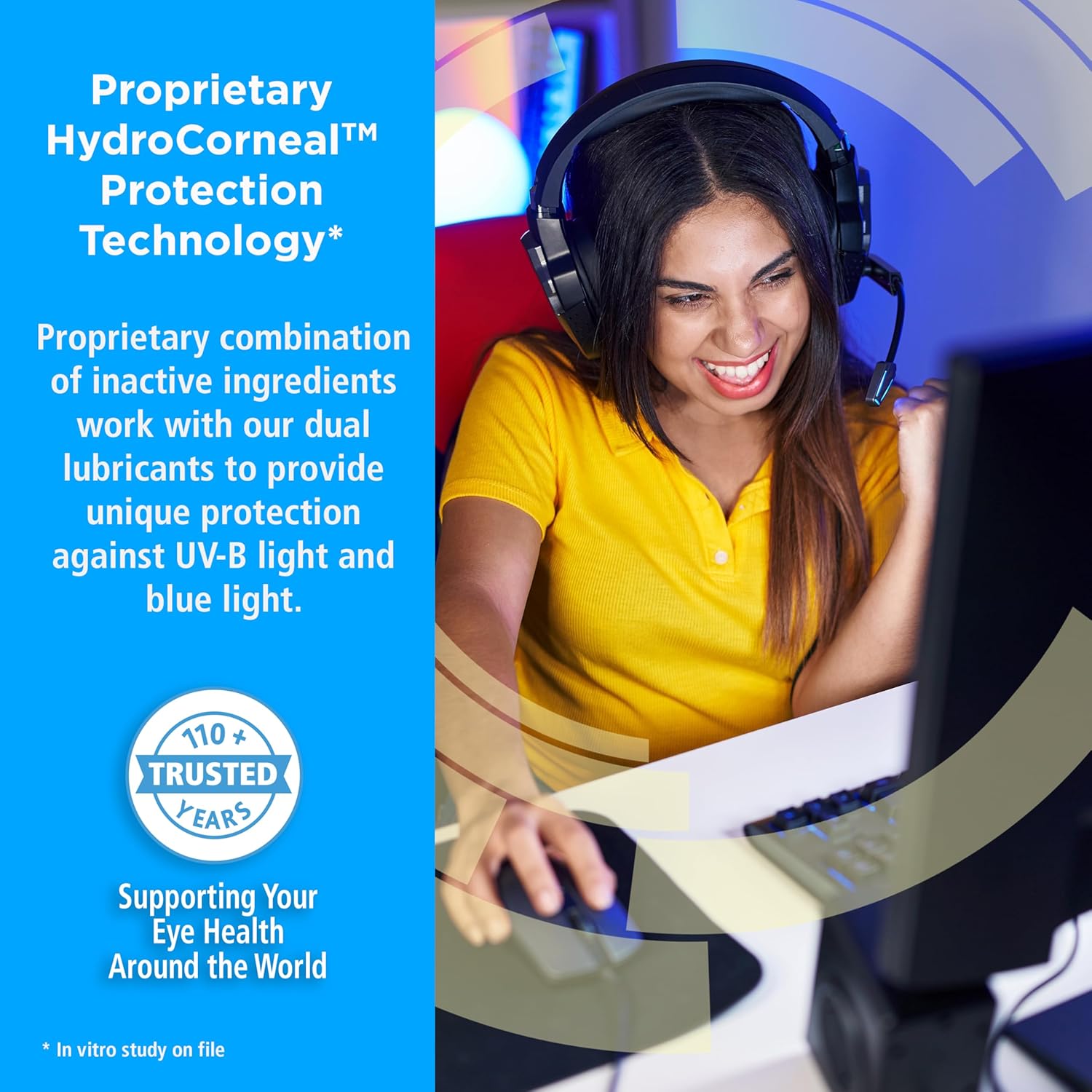 HYDROCORNEALTM PROTECTION TECHNOLOGY*: This unique protection technology guards against UV-B light and blue light damage caused by outdoor exposure or computer eye strain