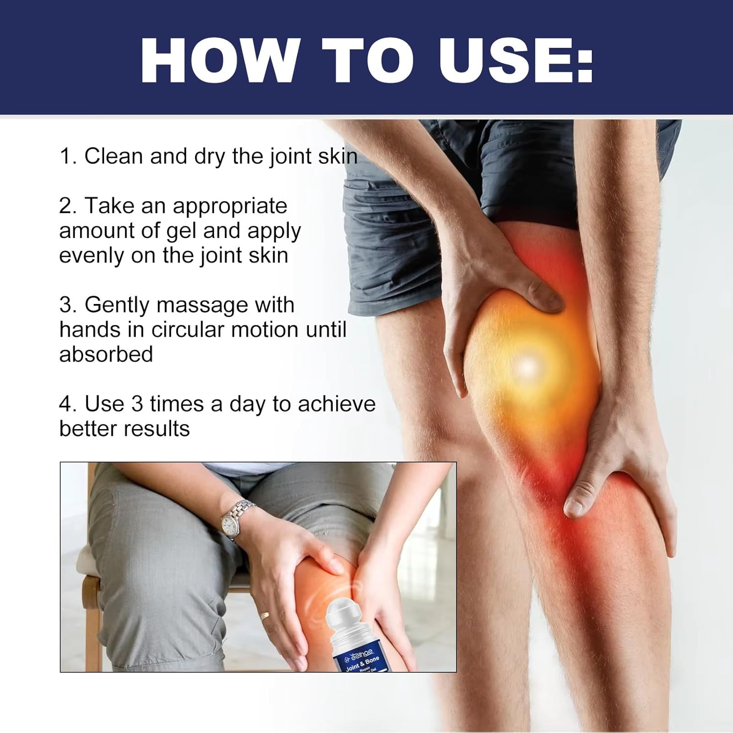 Roll-On Pain Relief Gel, specially formulated to provide fast-acting relief for sore knees, stiff joints, muscle fatigue, arthritis pain, sprains, and minor injuries. The convenient roll-on applicator allows for mess-free, targeted application, making it easy to use at home, work, or on-the-go.