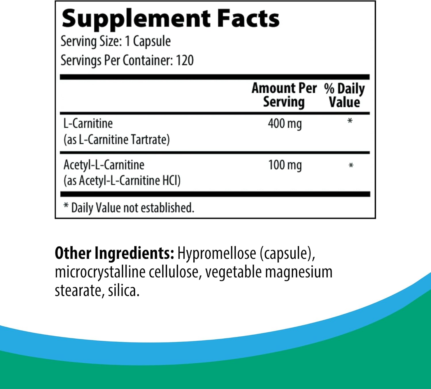 Carnitine Blend combines 400 mg L-carnitine and 100 mg acetyl-L-carnitine, in one convenient capsule for both physical and cognitive benefits, supporting muscle strength and brain function