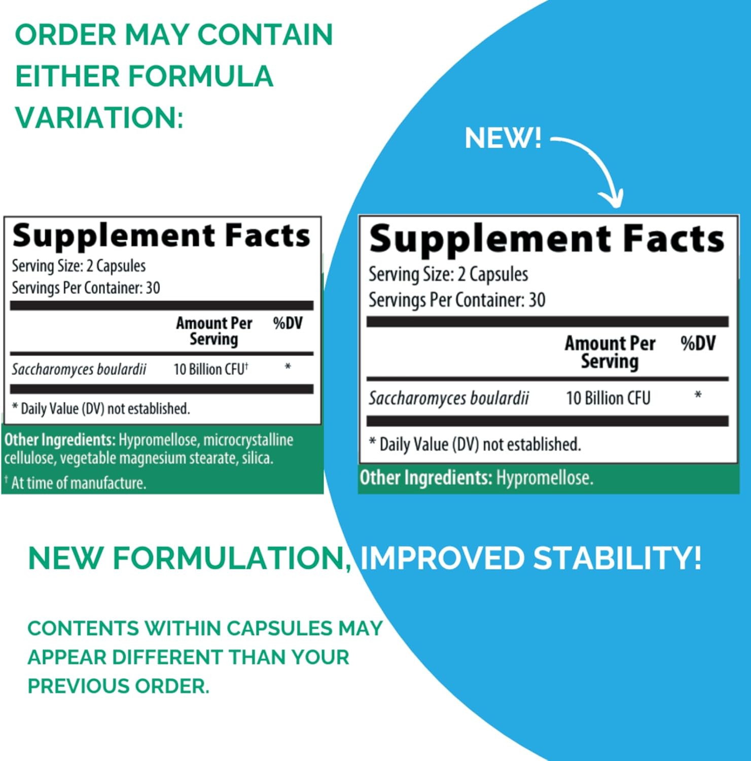 Upgraded formulation: Using the latest advances in raw materials, this product has been upgraded to a rod/bead-type of S. Boulardii instead of powder, inside the capsules. This form has a longer, more stable shelf life, and less inactive ingredients. You may get either version in your order as we transition inventory