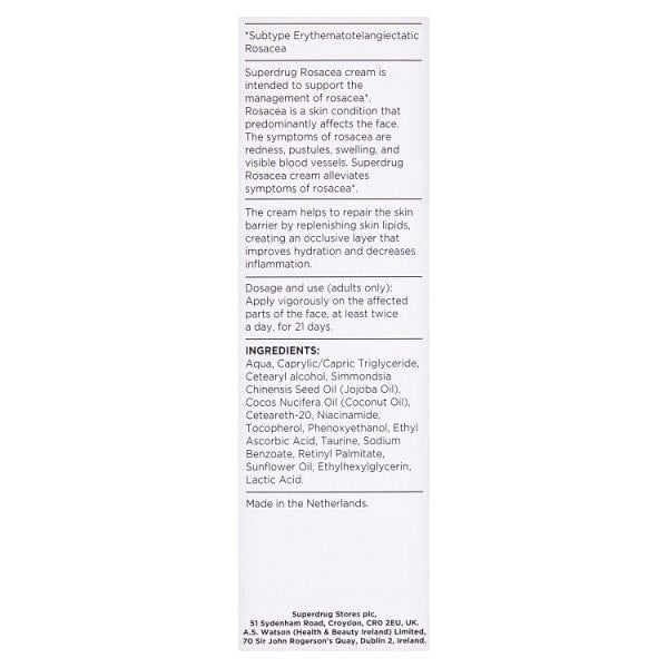 Product Information:The Sd Rosacea Cream Is A Medical Device Designed To Alleviate Symptoms Of Rosacea. It Relieves Dry Appearance, Dry Sensation, Stinging Sensation And Improves Softness And Suppleness Of The Skin,Features:Rosacea Cream Contains The Active Ingredient Jojoba Oil. It Helps Repair The Skin Barrier By Replenishing Skin Lipids, Creating An Occlusive Seal, Improving Stratum Corneum Hydration, Decreasing Inflammation And Reducing Microbes. Moisturizers Repair The Skin Barrier Through Two Major Mechanisms: 1) Providing Hydration Via Hydrophilic Constituents, And 2) Preventing Transepidermal Water Loss (Tewl) Via Hydrophobic Constituents To Occlude The Skin,Warning Or Restrictions:Warnings: - Keep Out Of Reach Of Small Children; - If You Are Suffering From Hypersensitivity Reactions, Stop Using Rosacea Cream; - Only For External Use; - Avoid Contact With Eyes Or Mucous Membranes. - Do Not Apply To Open Wounds Or Damaged Skin. - Do Not Use If You Are Allergic To One Or More Of The Ingredients,Product Specification:Ingredients Inci Function Composition Per Tube (30 Ml) % Purified Water Solvent 72,8200 Caprylic/Capric Triglyceride Solvent, Emollient 10,0000 Cetearyl Alcohol Emollient, Emulsifying 5,0000 Jojoba Oil (Simmondsia Chinensis) Active Ingredient 3,0000 Coconut Oil (Cocos Nucifera) Solvent, Emollient 2,5000 Cetylstearyl(20)Eo Emulsifying, Surfactant 2,0000 Niacinamide Smoothing 1,0000 Tocopherol Antioxidant 1,0000 Phenoxyethanol Preservative 0,9000 Ethyl Ascorbic Acid Antioxidant 0,6000 Taurine Buffering 0,5000 Sodium Benzoate Humectant 0,2000 Vitamin A Palmitate Skin Conditioning 0,1755 Sunflower Oil (Helianthus Annus) Masking, Skin Conditioning 0,1245 Ethylhexylglycerin Skin Conditioning 0,1000 Lactic Acid 0,0800 Total 100%,Product Uses:Dosage And Use (For Adults): Apply The Cream To Skin Affected By Rosacea At Least 2 Times A Day, Morning And Evening, For 21 Days