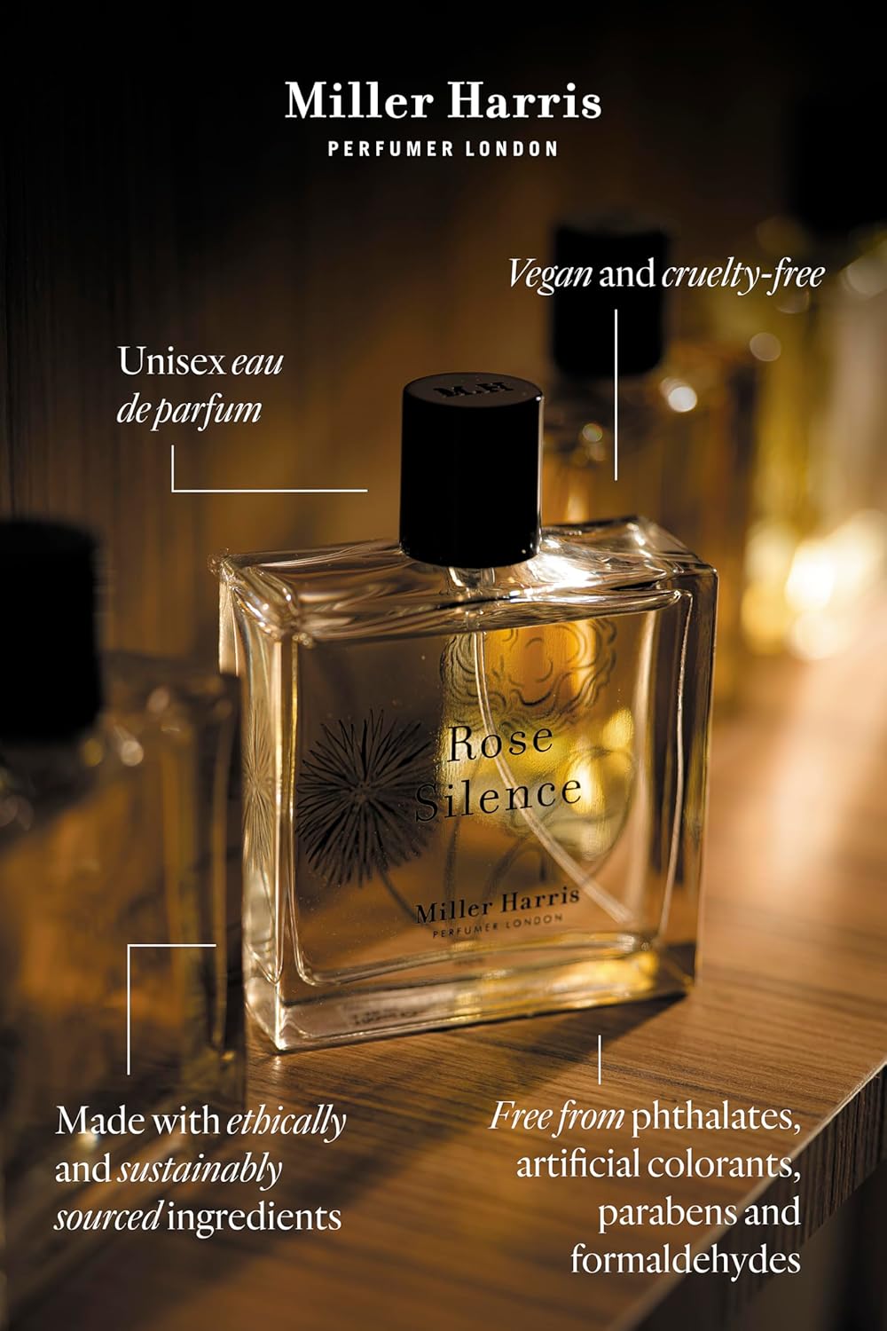 Rose Silence is a charming and modern rose perfume, a pure blossom of blushing ivory petals and a moment of stillness. The delicate sensation of cashmere merges with a garment of fresh petals stitched together, caressing the skin. A sweet resonance of fruits lifts the petals, tangy blackcurrant and juicy mandarin, whilst sandalwood and musks create an impression of warm skin. The rose sits alone, freshly picked and serene,Head Notes: mandarin, blackcurrant,Heart Notes: turkish rose absolute,Lasting Impressions: patchouli, cashmere musk,All Miller Harris products are suitable for vegan, free from phthalates, artificial colorants, parabens and formaldehydes. We use high levels of natural raw materials