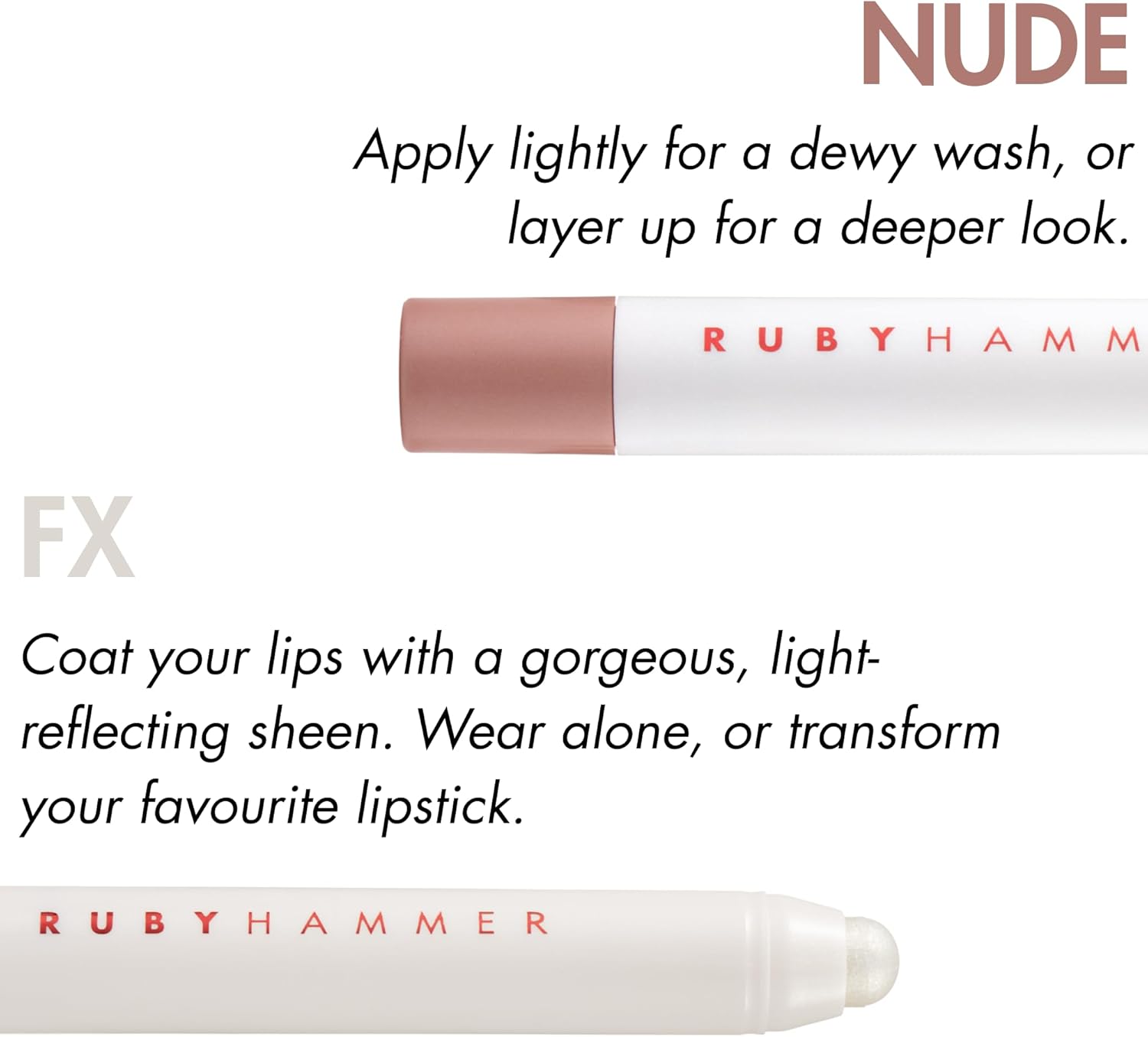 Product Description The perfect combination of skincare and colour Winner of ‘Best Lip Product breakthrough’ for the beauty shortlist awards 2023. Ruby Hammer hybrid lip serum balms are designed by an award-winning artist, to not only nourish and protect your lips with lasting, vitamin-enriched hydration, they also leave a dewy wash of colour so you can brave the elements with comfort and confidence. APPLICATION Unlike many lip balms, our soft, melting Lip balm serums are formulated to be light-wearing and easy to apply. WEAR Nourishing, smooth and tasteless with a non-drying effect, our lip serum balms are perfect for on-the-go, everyday wear. FINISH Ruby Hammer lip serum balms are created by an award-winning artist who understands how important it is to look and feel your best. Once applied, our lip balm leaves a long-lasting, even shiny finish. Nude Tinted Lip Balm Serum This Ruby Hammer Lip Balm is formulated to provide a soft nude-toned colour, creating a base of buildable colour to give your lips a subtle boost. Our lip serums can also be used with our FX or FX Gold products to add a dimension of subtle shimmer. NATURAL, NUTRIENT-ENRICHED INGREDIENTS Lipsticks rarely contain enough care ingredients which can mean they can take their toll, especially on sensitive dry lips. Our nutrient-rich lip serums are formulated with powerful natural ingredients to offer your lips the care and nutrition they need. These include: ? Cannabis Sativa Seed Oil: This oil helps to relieve skin inflammation to leave your lips feeling soft and supple. This ingredient is widely known for its anti-inflammatory properties to effectively soothe irritation and give your lips a youthful look. ? Meadowfoam Seed Oil: The moisturising qualities of this ingredient also acts as an emollient that creates a sealing barrier to lock moisture in. ? Cocoa Butter: The fatty acids in cocoa butter are well-known to soften dry lips and skin. ? Liquorice Leaf Extract: This ingredient smooths the skin around your lips to balance moisture content. ? Dipalmityl Hydroxyproline + Palmitic Acid: DHP strengthens your skin barrier to reduce the look of lines and wrinkles helping to give your lips a lifting effect. Ingredients BIS-BEHENYL/ISOSTEARYL/PHYTOSTERYL DIMER DILINOLEYL DIMER DILINOLEATE, ISOCETYL STEARATE, POLYBUTENE, DIISOSTEARYL MALATE, THEOBROMA GRANDIFLORUM SEED BUTTER, CANDELILLA CERA (WAX) HYDROCARBONS, SILICA, DIPENTAERYTHRITYL PENTAISONONANOATE, GLYCERYL CITRATE/LACTATE/LINOLEATE/OLEATE, CALCIUM SODIUM BOROSILICATE, CALCIUM ALUMINIUM BOROSILICATE, GLYCINE SOJA (SOYBEAN) PROTEIN, CANNABIS SATIVA SEED OIL, LIMNANTHES ALBA (MEADOWFOAM) SEED OIL, SYNTHETIC FLUORPHLOGOPITE, COPERNICIA CERIFERA (CARNAUBA WAX) CERA, SYNTHETIC BEESWAX, DIPALMITOYL HYDROXYPROLINE, PENTAERYTHRITYL TETRA-DI-T-BUTYL HYDROXYHYDROCINNAMATE, GLYCYRRHIZA GLABRA (LICORICE) LEAF EXTRACT, PALMITIC ACID, PHOSPHOLIPIDS, TIN OXIDE, TOCOPHEROL, TITANIUM DIOXIDE (CI 77891) P.when('A').execute(function(A) { A.on('a:expander:toggle_description:toggle:collapse', function(data) { window.scroll(0, data.expander.$expander[0].offsetTop-100); }); }); Directions Twist the base of the Lip Serum Balm to just over the tip of the pencil and apply to the lips as desired, leaving you with soft, supple lips Safety Warning Check the ingredients for personal allergens. See more,THE ULTIMATE LIP CARE MEETS COLOUR- More than just a balm, the Ruby Hammer Lip Serum Balm in FX is your go-to hybrid lip essential—delivering rich hydration with a buildable wash of colour. Thoughtfully formulated with nourishing actives and elegant pigment, this solid serum balm is your shortcut to smooth, plump-looking lips with a dewy finish,VISIBLY SMOOTHER LIPS- The luxurious solid serum texture melts on contact, leaving your lips feeling softer, smoother, and deeply conditioned with every application,BUILDABLE COLOUR IN EVERY SHADE- Each balm delivers a sheer, buildable flush of colour—whether you choose a subtle nude, a bold pop, or a touch of shimmer. Designed for both lips and cheeks, it works with your mood for easy, natural looking results,HYDRATION MEETS SKINCARE- Infused with Liquorice Leaf Extract, it helps smooth the skin around the lips while maintaining moisture balance—keeping lips looking fresh and youthful,COMFORTING & NOURISHING FORMULA- Each swipe is packed with vitamin-rich skincare ingredients that help hydrate and restore dry or chapped lips—supporting softer, smoother lips,SILKY, NON STICKY, SOFT MELTING TEXTURE- The buttery balm glides on effortlessly, delivering a smooth, glossy glaze without any tackiness. Designed to leave lips looking as good as they feel