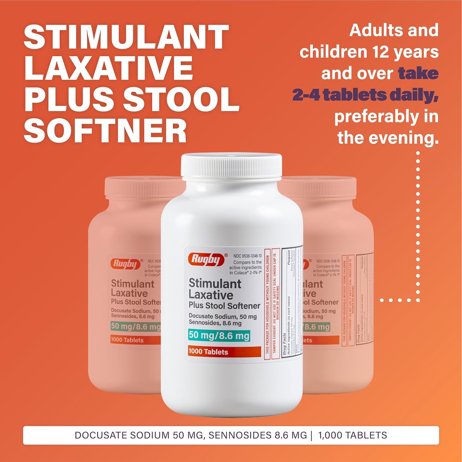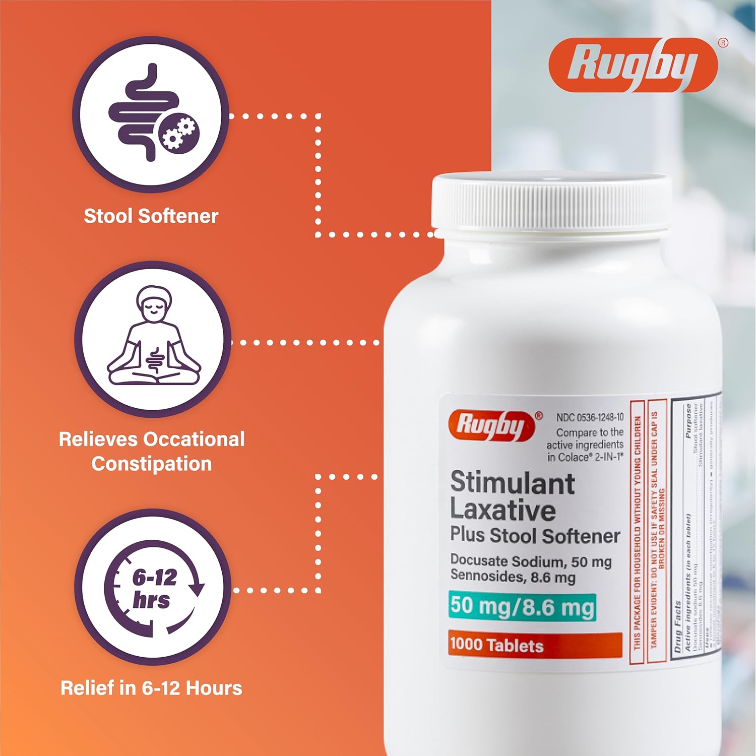 About this item LAXATIVE AND STOOL SOFTENERS: The Rugby Stimulant Laxative Plus Stool Softener relieves occasional constipation (irregularity) and generally promotes a bowel movement in 6 to 12 hours. ACTIVE INGREDIENTS: Each tablet contains docusate sodium 50 mg as a stool softener and sennosides 8.6 mg as a stimulant laxative. HOW TO USE: Take only by mouth. Doses may be taken as a single daily dose, preferably in the evening or in divided doses. Adults and children 12 years and over: take 2-4 tablets daily. Children 6 to under 12 years of age: take 1-2 tablets daily. Children 2 to under 6 years of age: take up to 1 tablet daily. Children under 2: ask a doctor. QUALITY FORMULATION: We maintain high standards of care through strict regulatory compliance to deliver carefully formulated, effective stimulant laxative and stool softener tablets. RUGBY LABORATORIES: At Rugby Laboratories, we believe wellness should be accessible to everyone. We pride ourselves on our legacy of delivering quality OTC and vitamin supplements. See more product details,LAXATIVE AND STOOL SOFTENERS: The Rugby Stimulant Laxative Plus Stool Softener relieves occasional constipation (irregularity) and generally promotes a bowel movement in 6 to 12 hours,ACTIVE INGREDIENTS: Each tablet contains docusate sodium 50 mg as a stool softener and sennosides 8.6 mg as a stimulant laxative,HOW TO USE: Take only by mouth. Doses may be taken as a single daily dose, preferably in the evening or in divided doses. Adults and children 12 years and over: take 2-4 tablets daily. Children 6 to under 12 years of age: take 1-2 tablets daily. Children 2 to under 6 years of age: take up to 1 tablet daily. Children under 2: ask a doctor,QUALITY FORMULATION: We maintain high standards of care through strict regulatory compliance to deliver carefully formulated, effective stimulant laxative and stool softener tablets,RUGBY LABORATORIES: At Rugby Laboratories, we believe wellness should be accessible to everyone. We pride ourselves on our legacy of delivering quality OTC and vitamin supplements