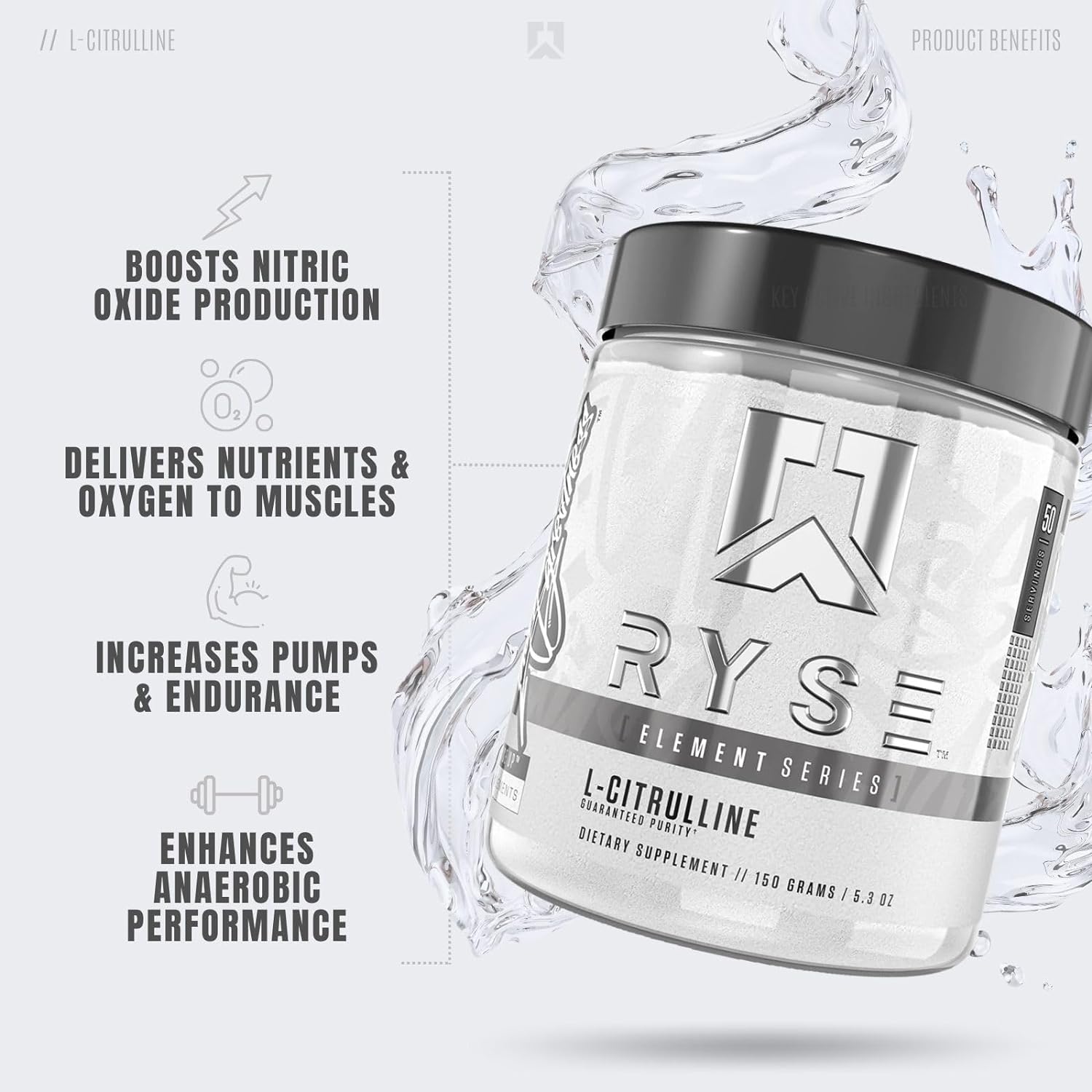 ?? STRENGTH, ENDURANCE, PUMPS: Introducing the newest single ingredient addition to the RYSE Element Series- pure L-Citrulline. L-Citrulline is a non-essential amino acid normally found in foods such as watermelon. It has blood flow boosting properties that make this a staple to stack with most pre-workout formulas?? HOW IT WORKS: L-Citrulline works by way of converting into arginine and has been known to increase nitric oxide & plasma arginine levels at a higher rate than L-Arginine itself due to the first pass effect where most arginine gets metabolized in the stomach prior to reaching the bloodstream?? BOOST NITRIC OXIDE: Nitric oxide is a molecule responsible for vasodilation, which allows more nutrients & oxygen delivery to your muscles at a faster rate. With L-Citrulline increasing nitric oxide levels, this supplement is made for better pumps, more endurance, & better overall performance?? PREMIUM INGREDIENTS ONLY: RYSE takes a unique approach to the lineup, utilizing the latest science and ingredients backed by clinical evidence. Not only do we use the best patented ingredients that are backed by research, we TEST multiple times. You'll always get what the label says and only use the highest quality ingredients, many are patented?? MADE IN THE USA: Our products are all proudly manufactured in the USA. Every product is made exclusively in manufacturing facilities that adhere to the strictest policies for quality and safety so you can use RYSE products with confidence